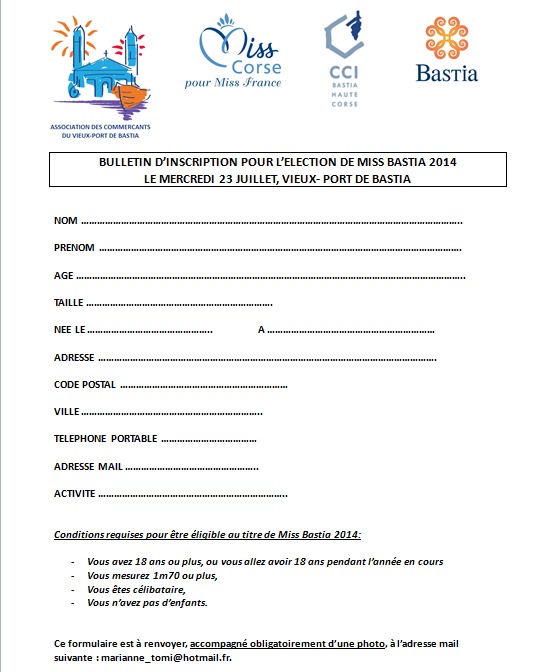 Si vous pensez que vous pouvez prétendre au titre de Miss Bastia ou bien si vous connaissez quelqu'un qui a toutes les qualités pour le devenir, remplissez ou faire remplir le bulletin ci-dessous et retournez-le à l'adresse indiquée.