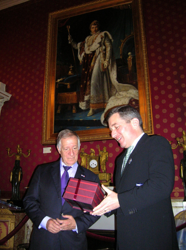 Un échange de médailles de la ville et de l’emblème napoléonien avec le drapeau aux 50 étoiles entre le maire d’Ajaccio et l’ambassadeur des USA a eu lieu, suivi d’une remise commune de cadeaux de bienvenue. Le maire d’Ajaccio pourra donc déguster des chocolats "made in USA" et Sir Charles H. Rivkin, se familiariser avec les saveurs de diverses spécialités nustrale ! La signature du livre d’or dans le bureau du maire d’Ajaccio a suivi.