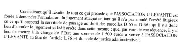 Le 3 mars 2011 la cour administrative d’appel donne raison à U Levante sur un nouveau point (lire jugement ). Le tribunal juge que la La cour administrative d’appel met également à la charge de l’État une somme de 1 500 euros à verser à l’association.suspension de la servitude sur les parcelles D65 et D66 est illégale.