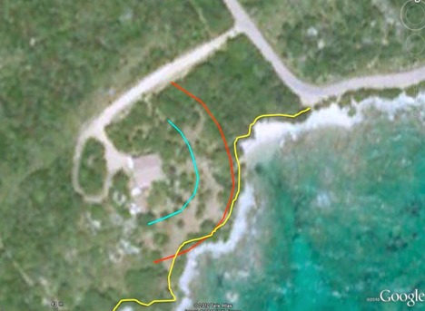 Ligne bleue : limite des 15 mètres autour de la maison • ligne rouge : limite des 30 mètres autour de la maison. Les deux lignes concentriques ont été tracées grâce à la fonction « Règle de mètres » du programme Google Earth. Ligne jaune le tracé du sentier souhaité (servitude légale).