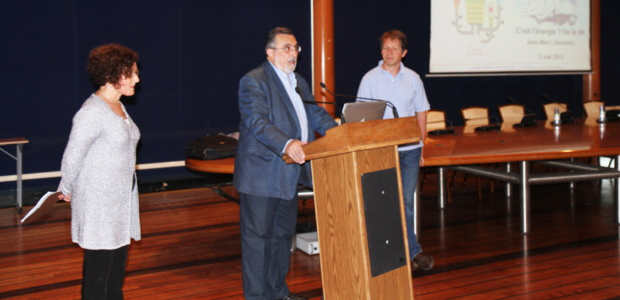 Maria Guidicelli, Paul-Antoine Luciani et Jean-Marc Jancovici vendredi au Palais des Congrès d'Ajaccio. (Photo Marilyne Santi)