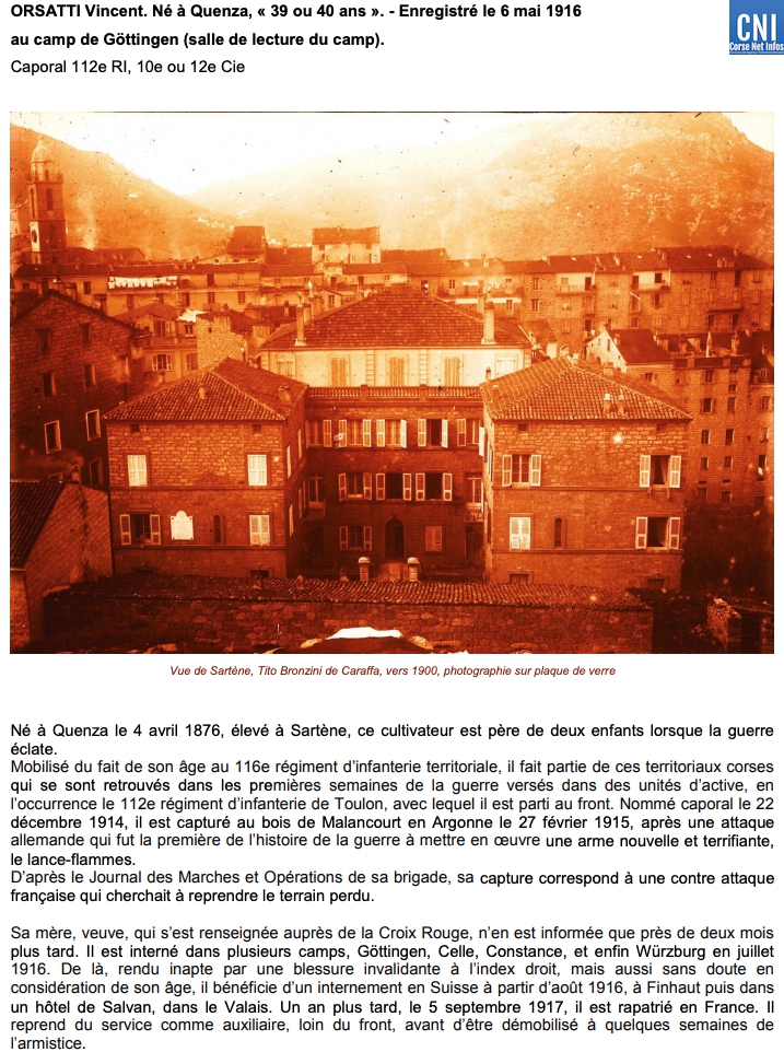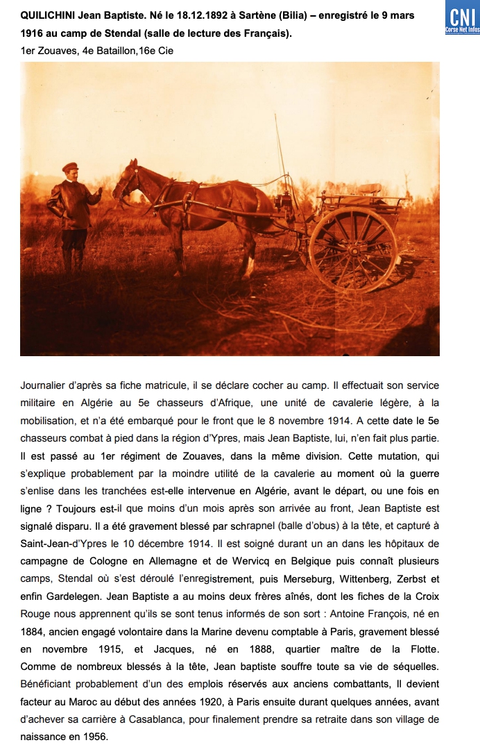 Il est alors détenu en Saxe Prussienne, à Stendal, un camp pour soldats. Capturé le 27 février 1915, Vincent Orsatti est interné dans le camp de Göttingen situé dans la province du Hanovre, puis enregistré le 6 avril 1916 par Wilhelm Doegen dans la salle des lectures. Carlo Anfriani et François Rasori se retrouvent internés en Saxe Prussienne à Königsbrück, un camp pour officiers et civils. Ils sont enregistrés séparément le 21 et 23 novembre 1916 dans une salle attenante à l’église du camp. Déporté à Wittenberg dans un camp de travail dédié aux travaux agricoles, forestiers et miniers, Jean Codaccioni échappe aux épidémies de Typhus qui y firent des milliers de morts. Il est enregistré au bureau d’information des prisonniers le 27 juin 2016.