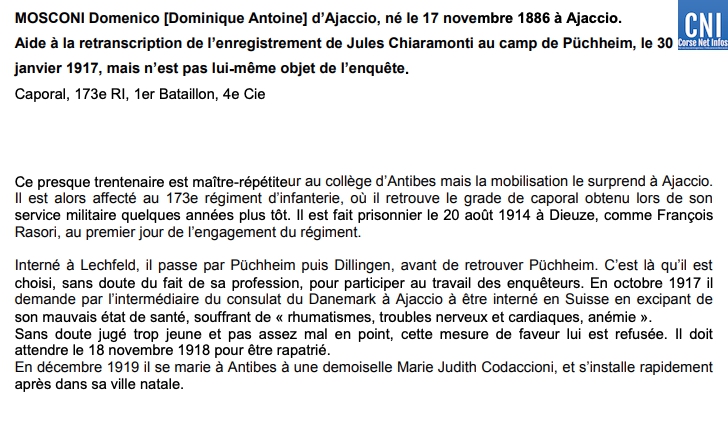 Entre 1916 et 1917, Jean Baptiste Quilichini, Jean Codaccioni, Vincent Orsatti, François Rasori, Carlo Anfriani, Jules Chiaramonti, Pierre Cesari, Jean Manuda et Dominique Mosconi sont sollicités dans le cadre de l’enquête de W. Doegen et H. Urtel.