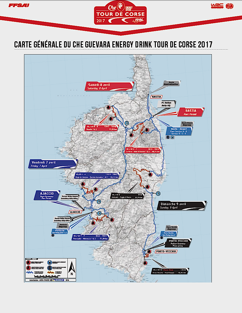 Un ‘Tour de Corse’ au sens propre du terme ; puisque l’épreuve rayonnera sur les deux départements de l’Île de Beauté, la Haute-Corse et la Corse-du-Sud, en faisant étape dans les principales villes de l’île. Bastia sera le centre névralgique de cette manche, accueillant notamment le Parc Fermé et le Parc d’Assistance du 6 au 9 avril 2017.