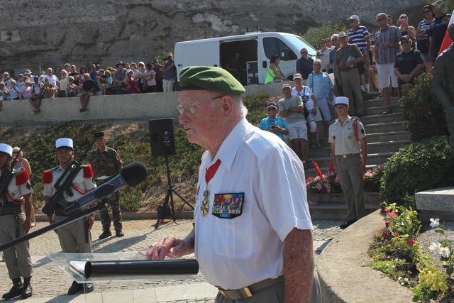 Au pied de la stèle, c'est avec une émotion toujours aussi forte que le colonel (er) rappelait les grands faits d'armes du Bataillon, jusqu'à cette opération en Corse : " Le Bataillon de Choc, unité spéciale entraînée pour agir sur les arrières ennemies, commandée par son créateur, évadé par l'Espagne comme une bonne partie de ses hommes, le chef de bataillon Gambiez, doit servir de "fer de lance" à l'opération.