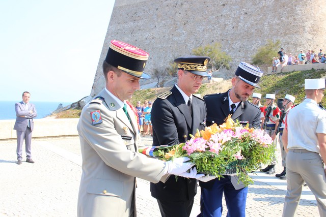 Il était ensuite procédé à plusieurs dépôts de gerbes. la première par Pierre Neuville, président de l'association des anciens du 1er Choc, Claude Deceuninck, président de l'association des anciens combattants de Calvi-Galeria et Marc-Paul Luciani, directeur du service départemental de l'Office National des Anciens Combattants et Victimes de Guerre de Haute-Corse; la seconde par Ange Santini, maire de Calvi, Pancrace Guglielmacci, adjoint au maire et Marie-Laurent Guerini, conseiller municipal; la troisième par Jérôme Seguy, sous-préfet de Calvi, colonel Jean de Monicault, chef de corps du 2e REP de Calvi et le capitaine Pascal Hervé, commandant en second de la compagnie de gendarmerie de Calvi.