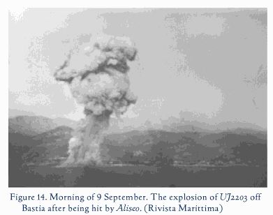Le 9 septembre 1943, à 2 heures du matin, l’amiral italien Catalano avait donné l’ordre au torpilleur « Aliseo » et à la corvette « Cormorano » de croiser, à 6 heures, à dix milles au large de la côte, afin d’éviter d’être atteints par un éventuel tir des batteries côtières allemandes installées dans la zone donnant sur le port de Bastia et de capturer tout navire allemand sortant de ce port. A l’aube, les neuf unités allemandes - deux chasseurs de sous-marins et sept barges - commencèrent à appareiller. L’amiral avait obtenu de l’état-major de l’armée de terre que les batteries côtières italiennes puissent balayer la zone située à l’extérieur de la passe afin de toucher les unités allemandes qui la franchiraient.