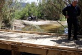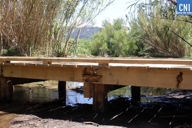 Ce chantier, situé comme vous pouvez le constater en bout de la plage d'Aregno, a été réalisé en a peine plus d'un mois. Il a aussi nécessité d'un travail de débroussaillage important ainsi que la création d'un platelage sur pilotis en châtaigner. La passerelle, d'une longueur de 11 mètres, réalisée, pour le socle en bois de châtaignier de Corse aura coûté 20 000€ HT.
