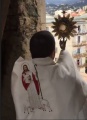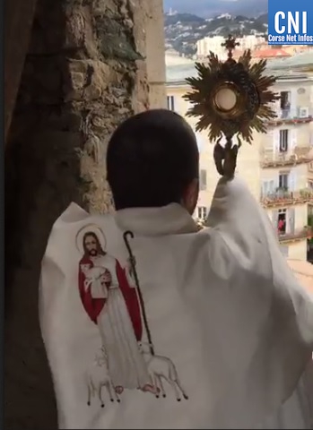 Aux quatre coins de celui-ci, le prêtre a béni la ville avec le Saint Sacrement. Dans les immeubles alentours les gens s’étaient postés sur leur balcon ou ouvert leurs fenêtres, une bougie à la main.