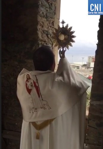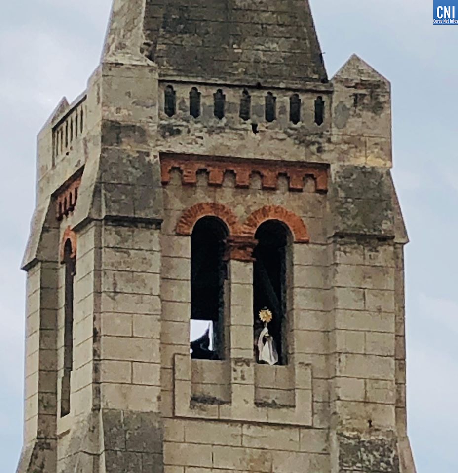 A midi les cloches de l’église ont sonné à toute volée, accompagnées par la sirène du « Pascal Paoli » de la Corsica Linea, amarré non loin de là, au port de commerce. Après quelques prières au Seigneur et à la Vierge Marie, le Père Georges Nicoli et son vicaire, l’abbé Paolo-Victor Lombardi, ont porté le Saint Sacrement tout en haut du clocher.