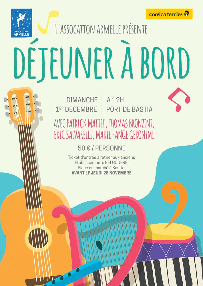 Le premier d'entre eux, un repas-concert organisé en partenariat avec la Corsica Ferries, aura lieu le dimanche 1er décembre prochain à 12 heures, à bord de l'un des bateaux de la compagnie (voir affiche ci-dessous). Les fonds récoltés seront entièrement reversés à l’association Armelle.