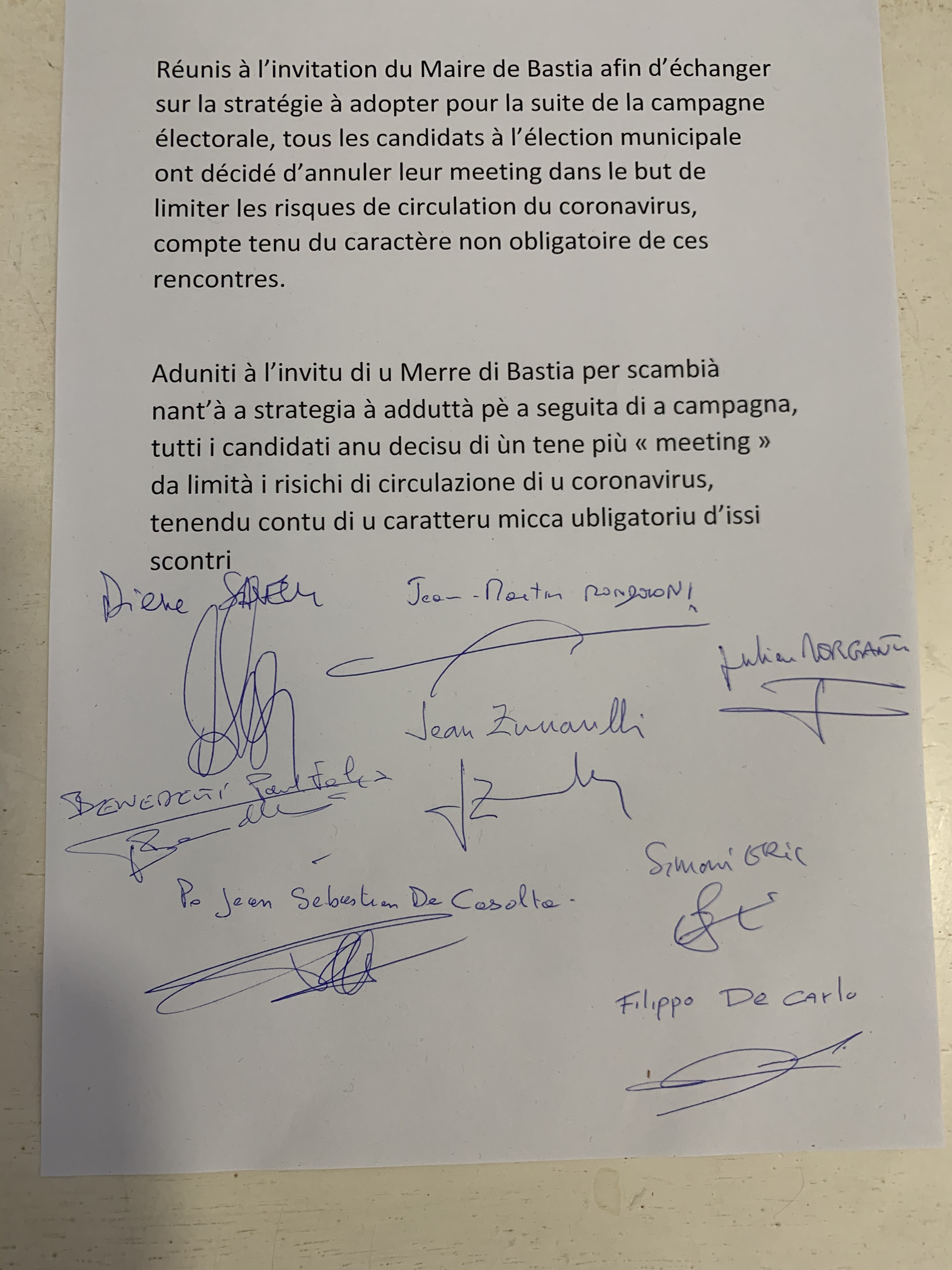 Ce samedi les candidats aux élections municipales de Bastia se sont réunis, à l'initiative du maire Pierre Savelli, pour décider de la suite à donner à la campagne électorale. Après près de trois heures de discussion les huit têtes de liste ont annoncé que « compte tenu du contexte lié au Coronavirus et par mesure de précaution » tous les meetings de fin de campagne seront annulés.