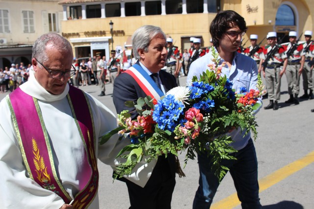 L'abbé Ange-Michel Valery invitait ensuite à la prière avant de procéder à la bénédiction du Monument aux Morts. Claude Deceuninck, président de l'association des anciens combattants, accompagné de François Martelli et d'Antoine Parenti déposaient une première gerbe, suivie d'une seconde par le Maire de Calvi Ange Santini, accompagne de l'abbé Valery et de Marie-Laurent Guerini, benjamin du conseil municipal. Enfin, une troisième gerbe était déposée par Jérome Seguy, sous-préfet de Calvi, le Lieutenant-colonel Favrot commandant en second du 2e REP et le Commandant Olivier Burles, commandant la compagnie de Gendarmerie de Calvi-Balagne. Outre les personnes déjà citées, on a noté la présence de Françoise Sévéon et Marie Luciani, adjointes au Maire de Calvi, Pancrace Guglielmacci et Didier Bicchieray, adjoints au Maire de Calvi, capitaine Stéphane Orticoni, responsable du Service Nautique à la Direction des Unités Territoriales du SDIS de Haute-Corse, Jeanine Maraninchi, retraitée de l'Armée de l'air, lieutenant Céline Gouret, commandant la Communauté de Brigades Calvi-Balagne...