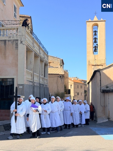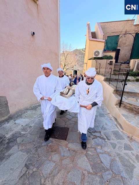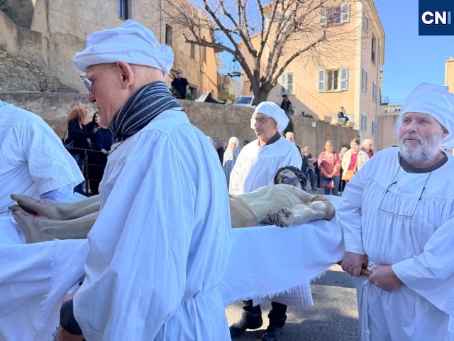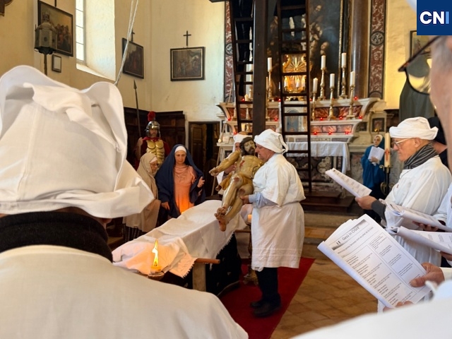 Sur l’estrade, la scène se joue avec une intensité saisissante. Marie, Joseph, Marie-Madeleine entourent le Christ. La Vierge, figure centrale, incarne une mère en deuil, chantant sa douleur en corse. Une plainte qui traverse l’église et vient toucher chacun au plus intime. « C’est une célébration chantée, et la ferveur y est… «on le sent tout de suite », confie un confrère présent.