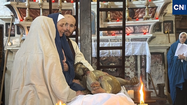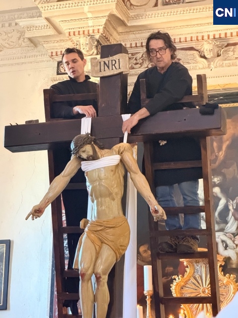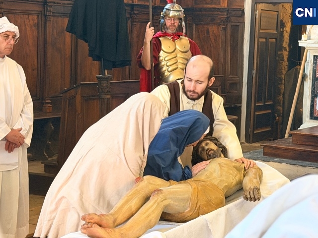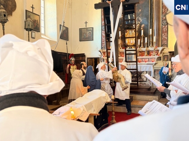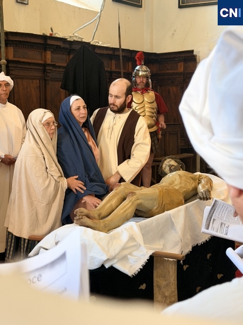 Au cœur du rituel, un élément rare, une statue du Christ articulée, de taille humaine, descendue de sa croix selon un protocole précis et exigeant. Une scène impressionnante, rendue possible par un dispositif minutieux qui mobilise plusieurs hommes. « Il faut être une dizaine pour descendre la croix, tout est organisé avec un système de poulies. C’est quelque chose de très technique, mais surtout très symbolique », explique Jacques Martelli.