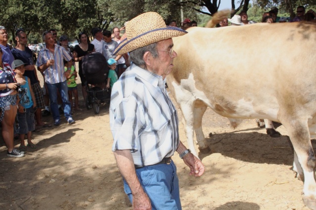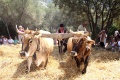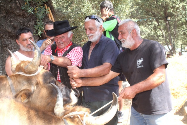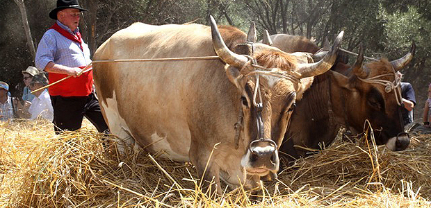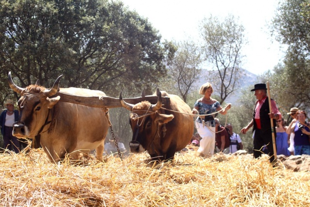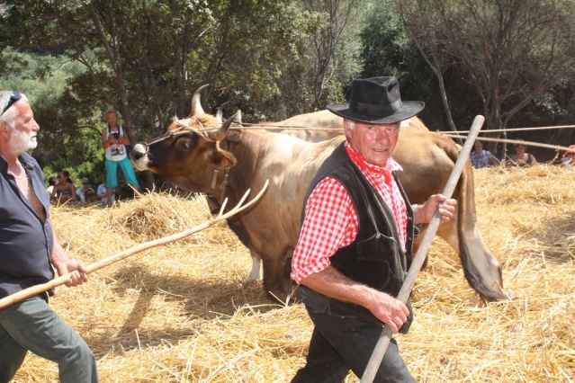 Sur l'aghja, l'aire de battage, deux bœufs, liés entre eux traînent une lourde pierre « U tribbiu » qui écrase les céréales.