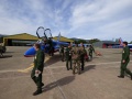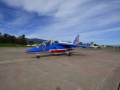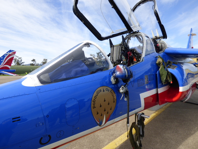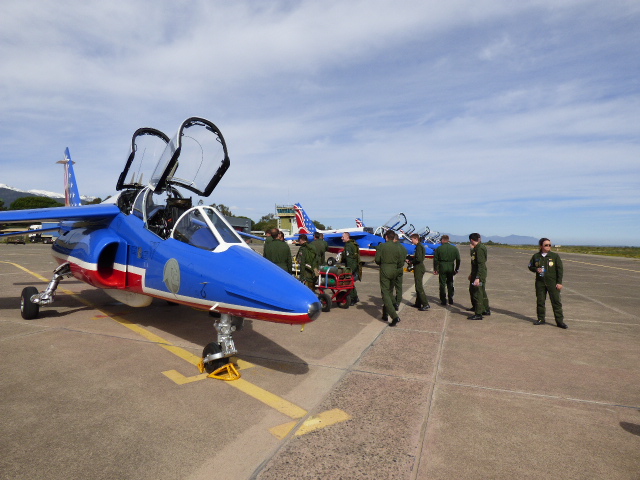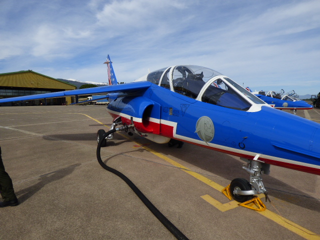 En attendant, les alpha jets s’alignent en piste 36 pour un décollage en patrouille. Puis c’est la reconnaissance des axes et des points de repères particuliers. Vient enfin le début du spectacle tant attendu. Ailes dans ailes, les aéronefs évoluent avec une précision toute diabolique dans l’espace. Dans des volutes de fumées bleues blanches et rouges lâchées à bon escient par les pilotes, les figures s’enchaînent les unes après les autres. King flaps, avions l’un derrière l’autre effectuant des tonneaux simultanés, vols dos, éclatements, croisements à grande vitesse et basse altitude, ticking clocks, le premier avion vole rectiligne en enchaînant des tonneaux tandis que le deuxième lui tourne autour en tonneaux barriqués, autant de prouesses techniques qui en disent long sur la qualité des entraînements et la maîtrise des pilotes qui sont, rappelons le, tous pilotes de chasse ayant totalisé au minimum 1500 heures de vol et ayant exercé comme chefs de patrouille.