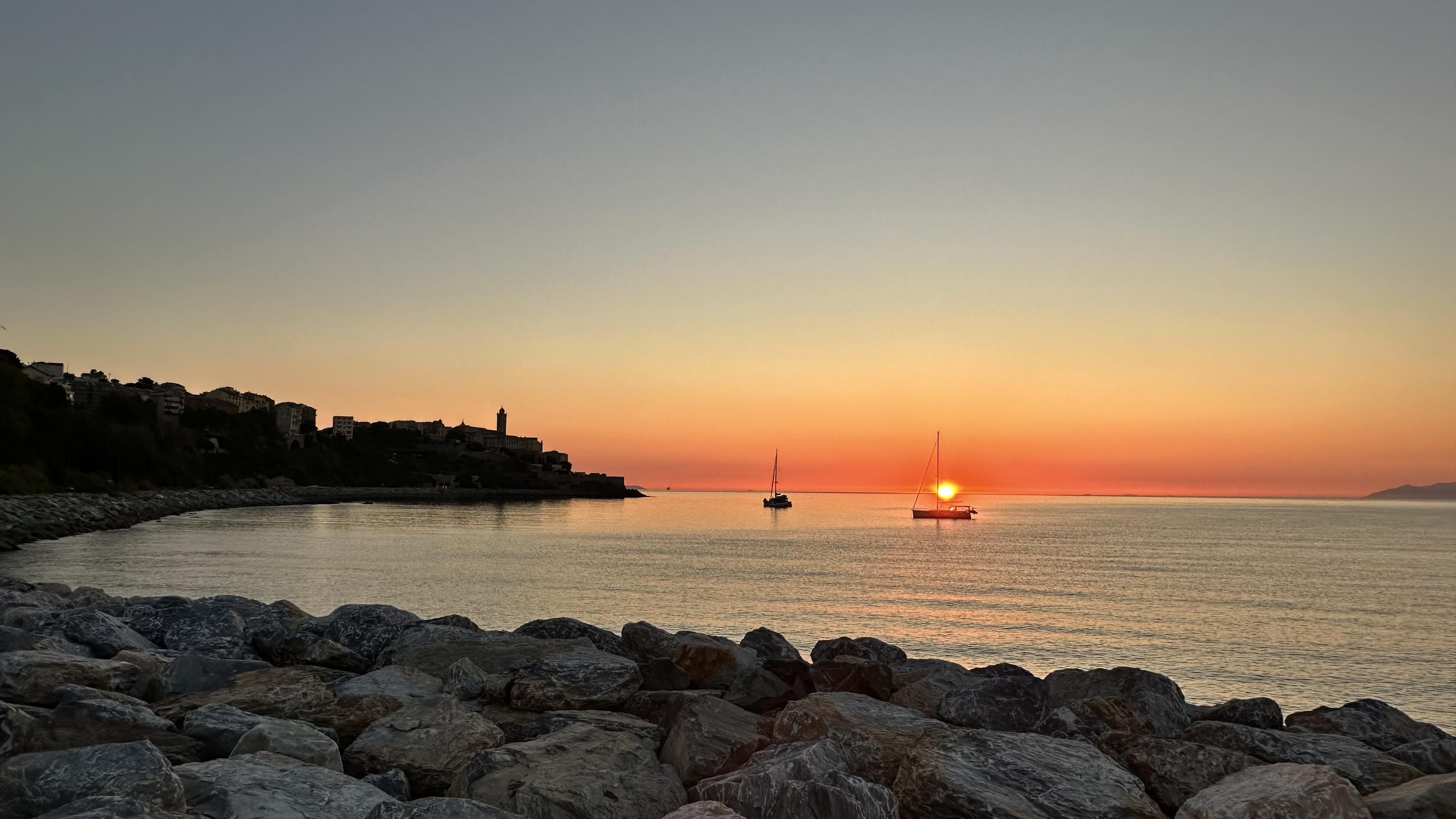 À l’aube d’un été brûlant, le soleil s’élève lentement sur l’anse de Ficaghjola, à Bastia. Les mâts immobiles des voiliers découpent le ciel, tandis que la Citadelle et Terra Nova, figées entre ombre et lumière, veillent sur la mer encore endormie.