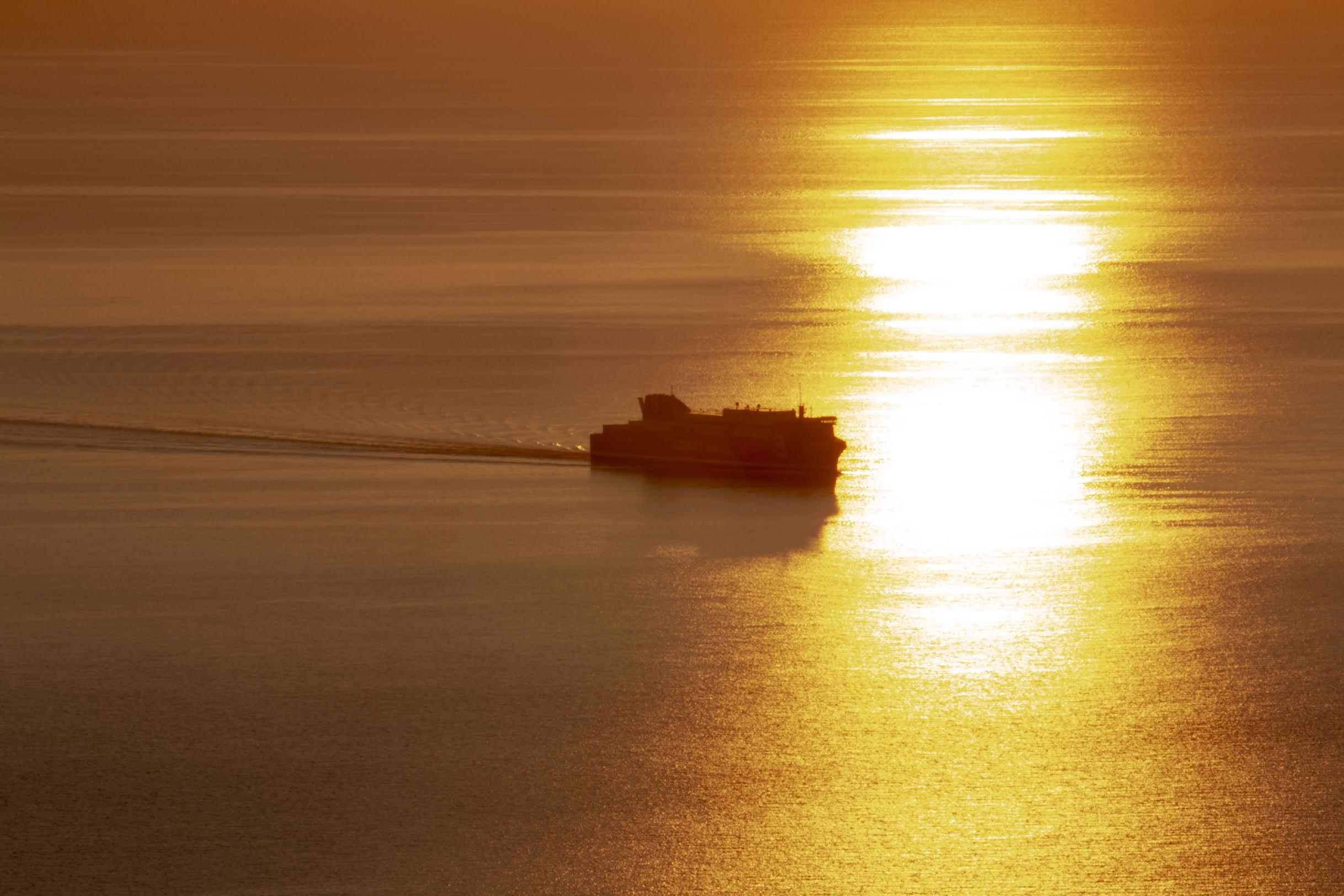 À l’aube, dans une mer Tyrrhénienne baignée d’or, un navire termine sa traversée nocturne en approchant le port de Bastia. L’instant est suspendu entre la fin du voyage et le lever du soleil dans le calme du canal de Corse.