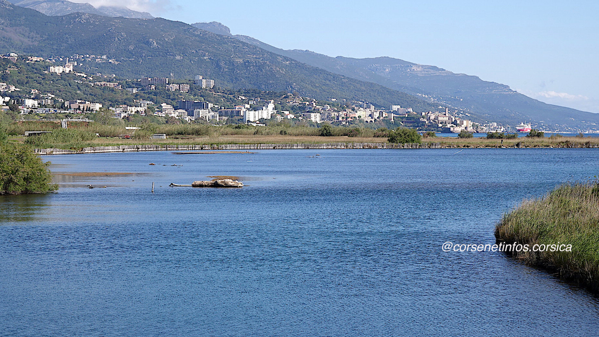 Depuis le lido de la Marana, la ville de Bastia se dévoile entre mer et montagne, avec en toile de fond le port et les reliefs du Pignu et du Cap Corse.