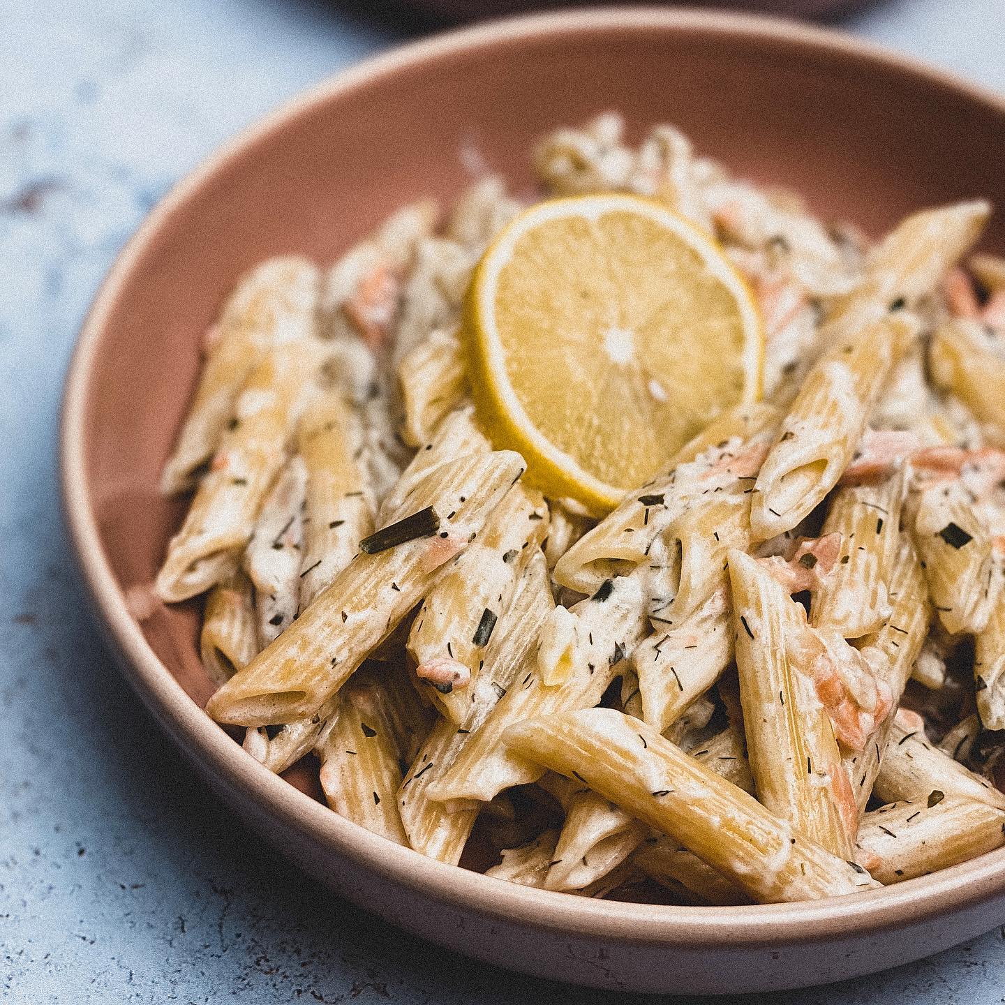 4/ Enfin ajouter 100ml d’eau de cuisson et les pâtes cuites. Bien mélanger et servir aussitôt. Saupoudrer d’aneth séché et de poivre.