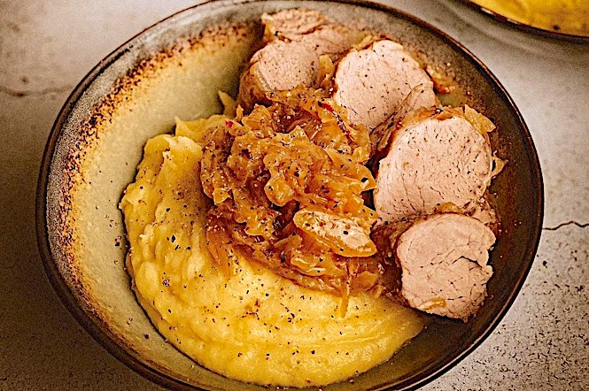 7/ dégustez encore chaud avec un écrasé de pomme de terre et les oignons confits.