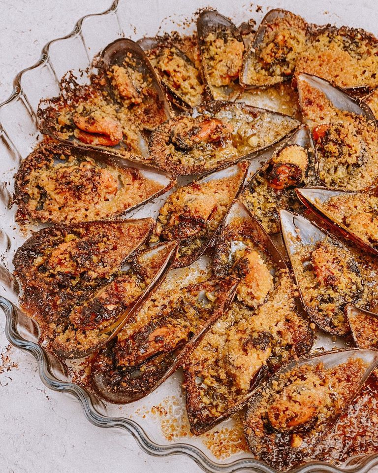 10/ quand les moules sont dorées et croustillantes sortez le plat et dégustez encore chaud avec une salade verte.