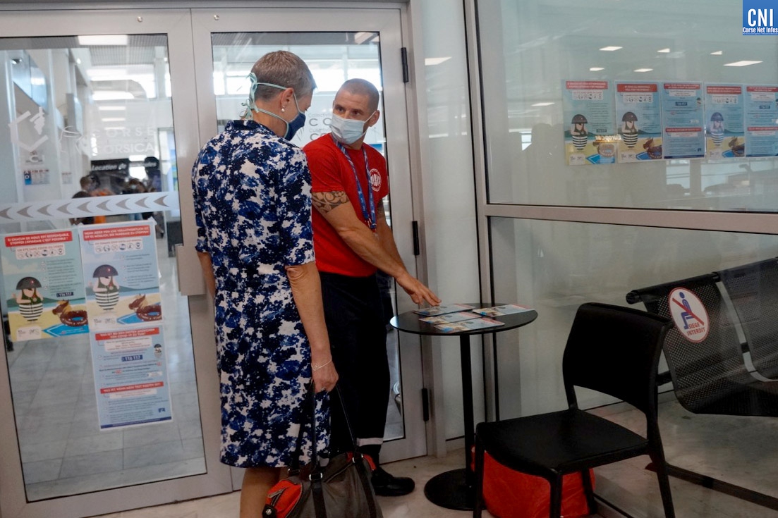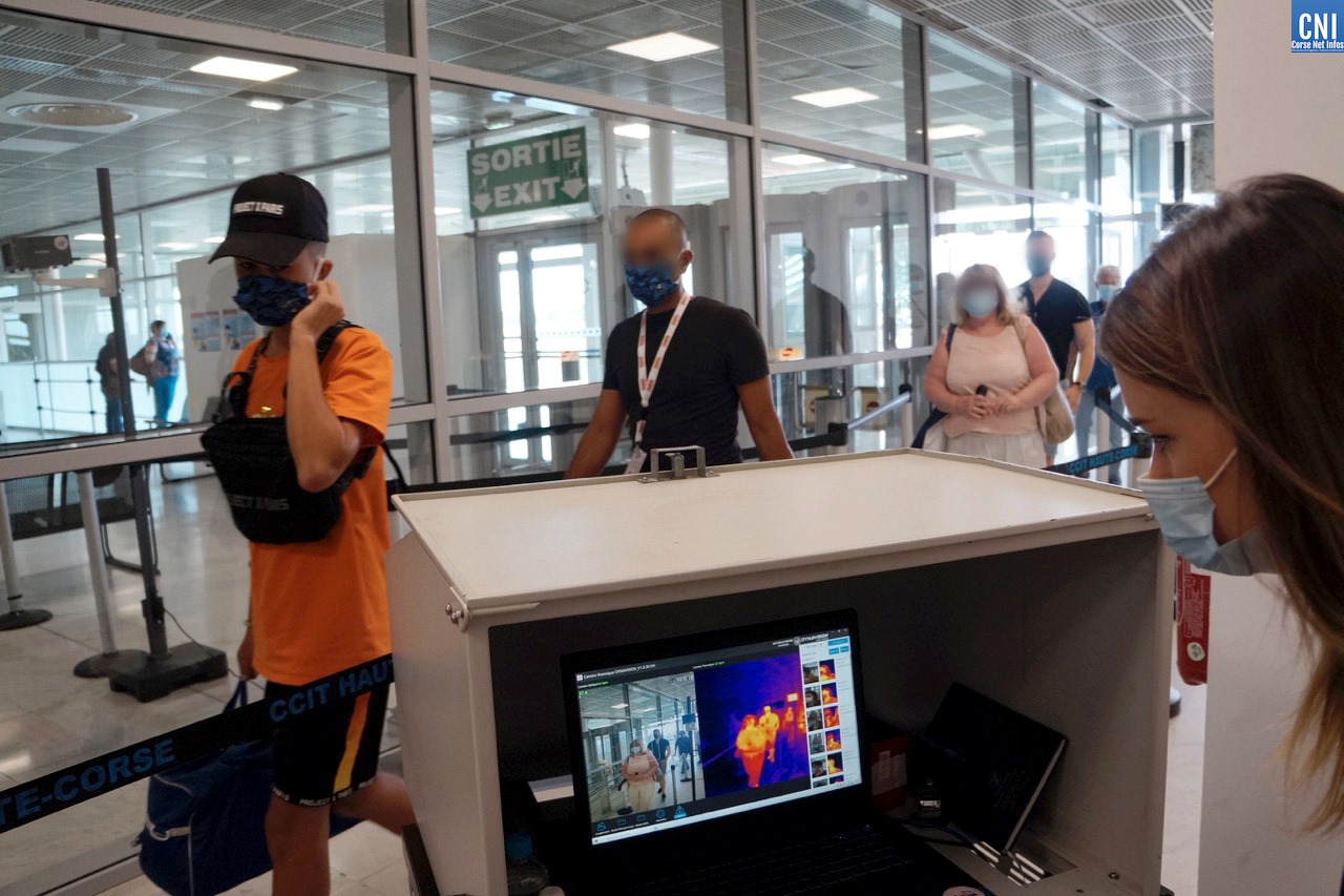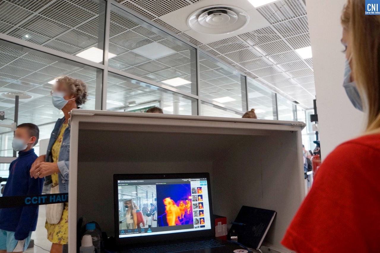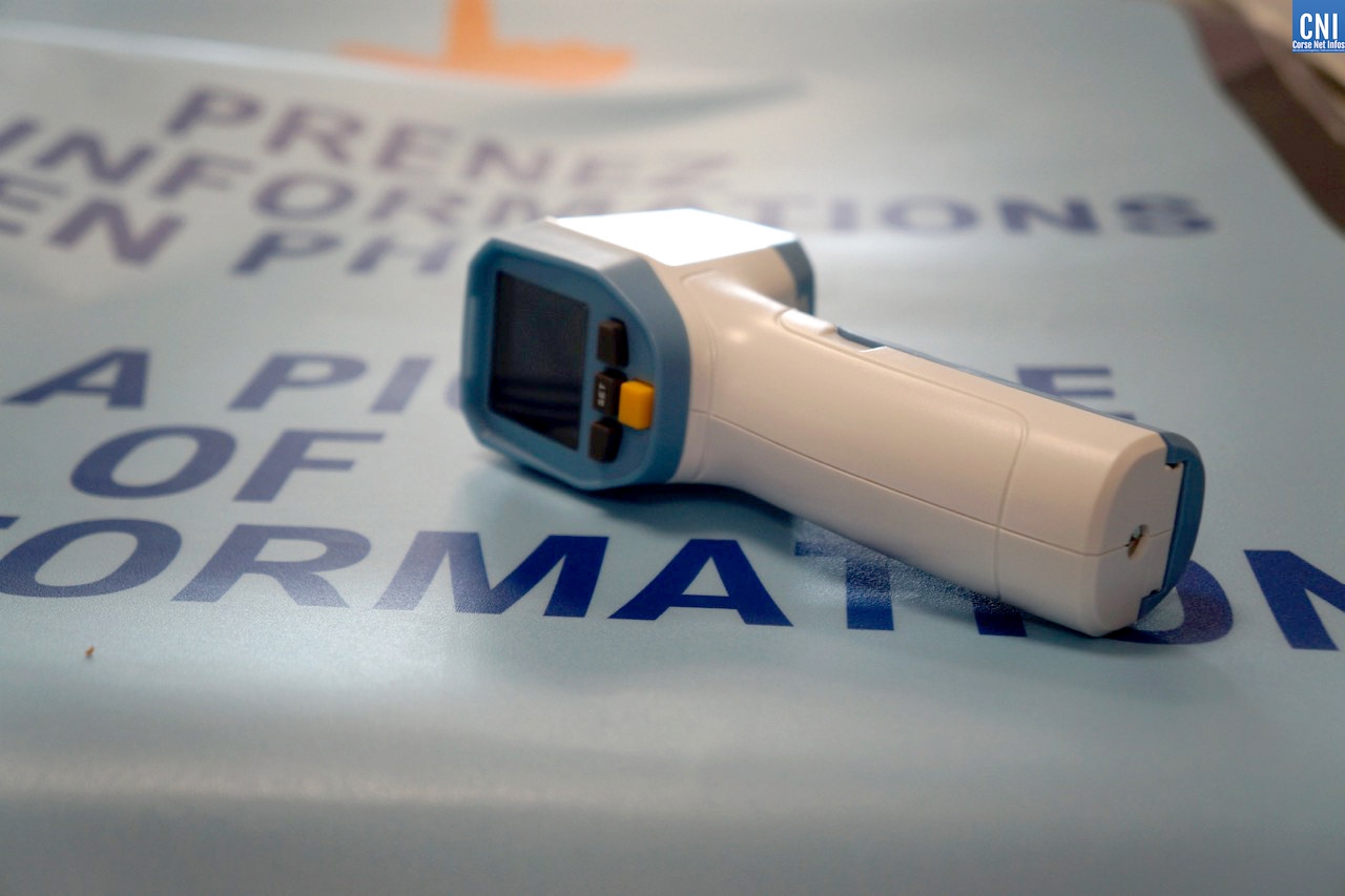 Il est un peu plus de 9h30 quand l’avion de Marseille atterrit à Poretta. A son bord, un centaine de personnes qui vont inaugurer le système de caméras thermiques mis en place conjointement par la Chambre de Commerce et d’Industrie, la Préfecture et l’Agence Régionale de Santé de Corse. Le but ? Repérer un passager qui présenterait une température supérieure à 38° afin de le diriger vers un point d’information. Là, il peut être pris en main par un agent de sécurité pour vérifier sa température à l’aide d’un thermomètre frontal et lui transmettre les brochures d’information. Un manière de l’inciter à consulter immédiatement un médecin ou à appeler le numéro dédié aux consultations COVID, le 116 117.