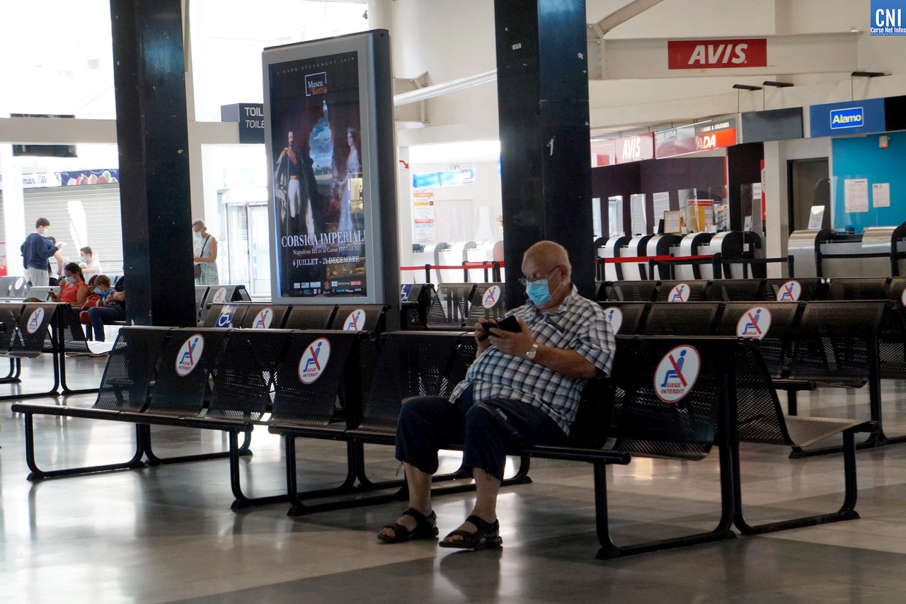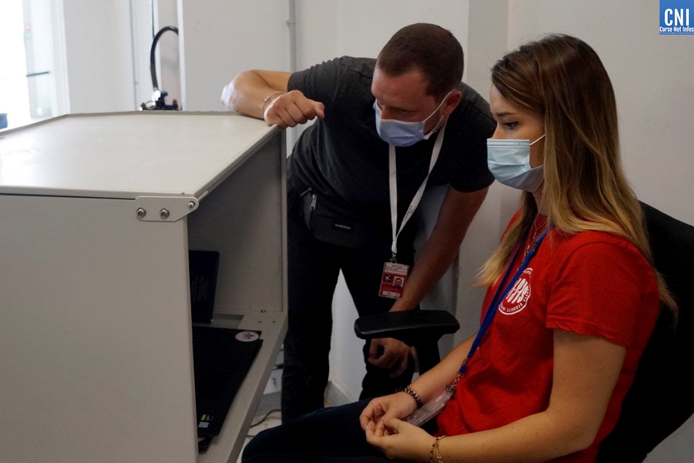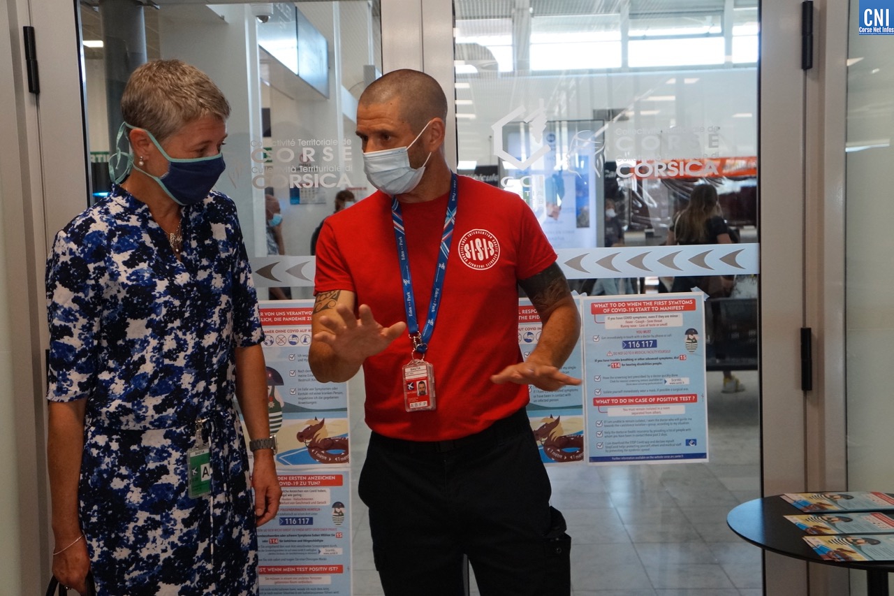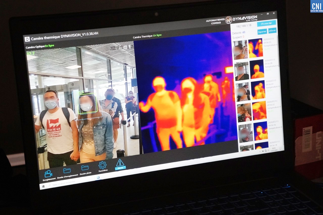 Il est un peu plus de 9h30 quand l’avion de Marseille atterrit à Poretta. A son bord, un centaine de personnes qui vont inaugurer le système de caméras thermiques mis en place conjointement par la Chambre de Commerce et d’Industrie, la Préfecture et l’Agence Régionale de Santé de Corse. Le but ? Repérer un passager qui présenterait une température supérieure à 38° afin de le diriger vers un point d’information. Là, il peut être pris en main par un agent de sécurité pour vérifier sa température à l’aide d’un thermomètre frontal et lui transmettre les brochures d’information. Un manière de l’inciter à consulter immédiatement un médecin ou à appeler le numéro dédié aux consultations COVID, le 116 117.