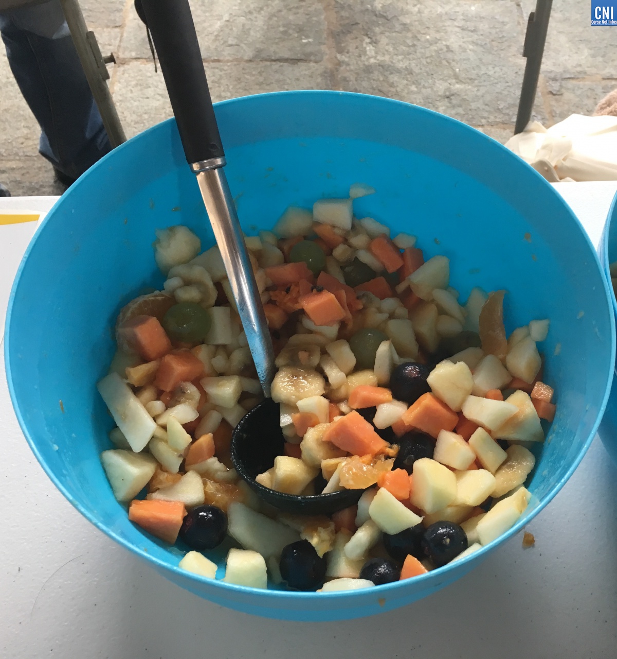 "Les supermarchés et commerçants nous ont donné des fruits déformés et altérés de la veille. Nous avons préparé des salades de fruits que nous avons distribué sur place. Nous souhaitons sensibiliser les citoyens. Lorsqu'un fruit est déformé ou abîmé il est toujours comestible. Il peut être coupé en salade de fruits comme ici, en compote ou confiture" explique Cassandra Fratacci, chargée de communication CCBVIR et CIAS Balagne.