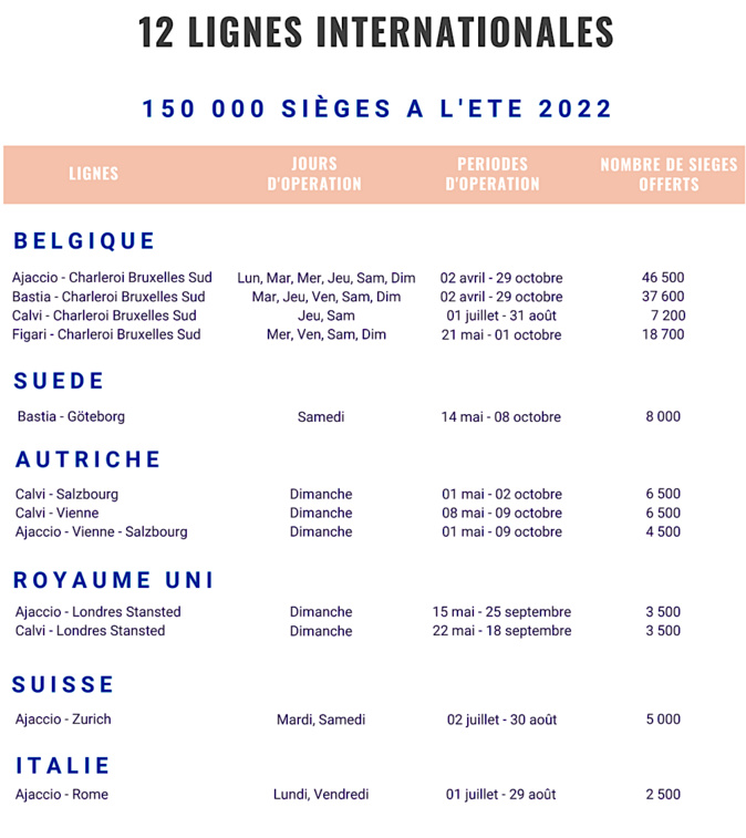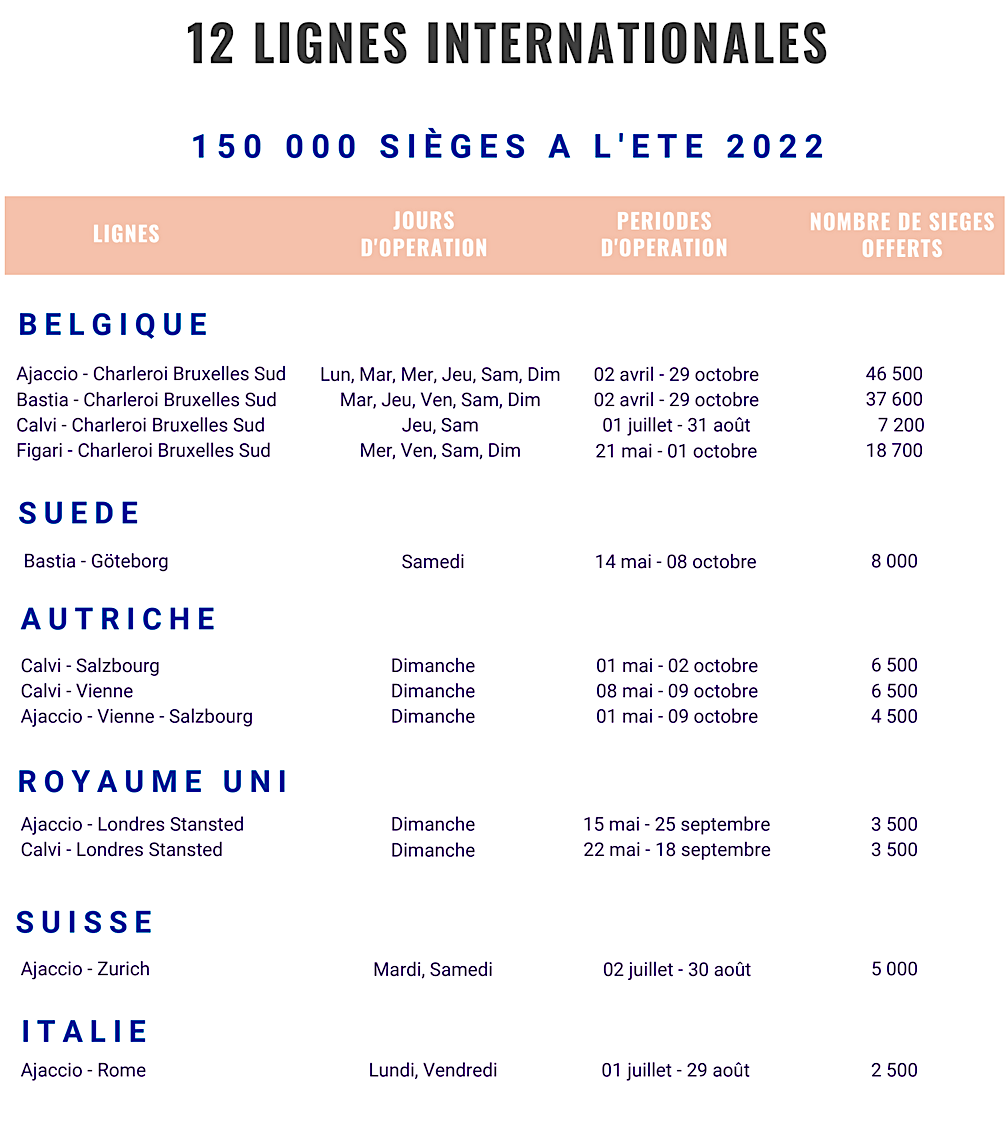 La destination Belgique - Charleroi - avec 6 vols hebdomadaires au départ d'Ajaccio, 5 de Bastia, 4 de Figari et 2 de Calvi avec une offre totale de 100 000 sièges durant la saison estivale, confirme, au-delà du fait que Air Corsica est, au plan de la desserte, la première compagnie au départ et à destination de la Corse, le succès de cette desserte.