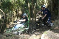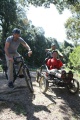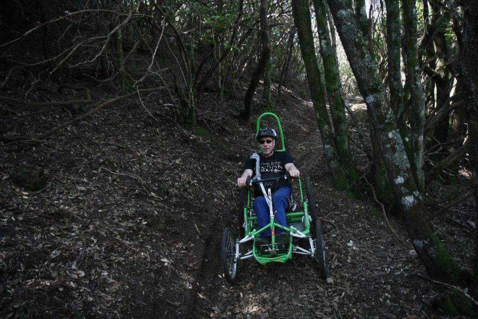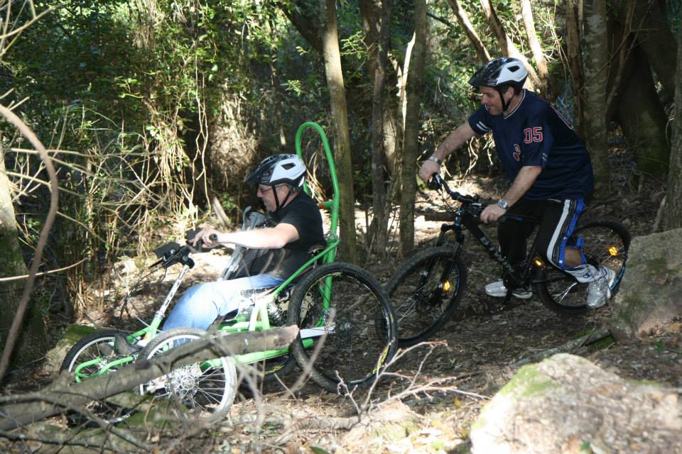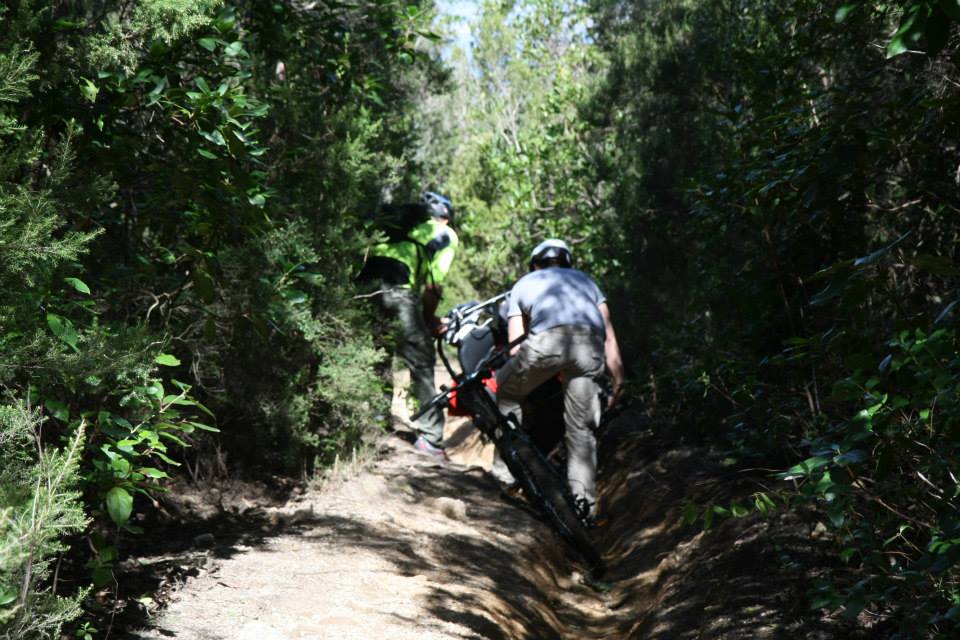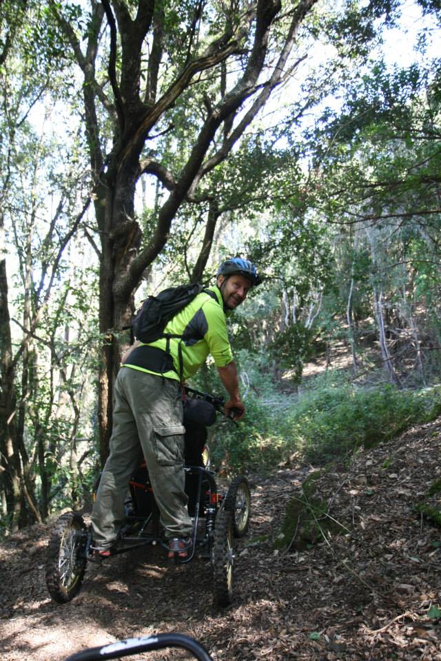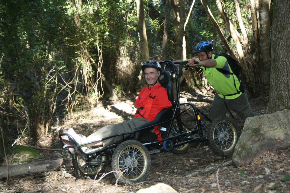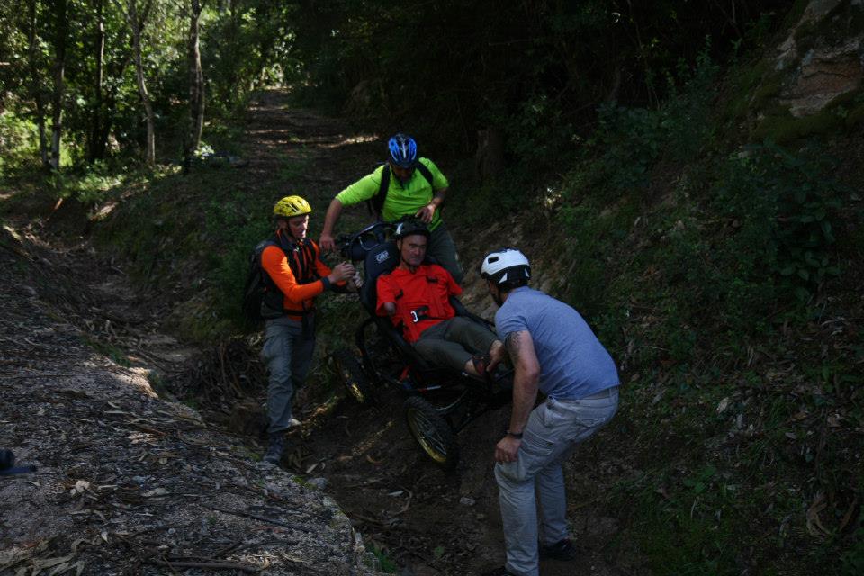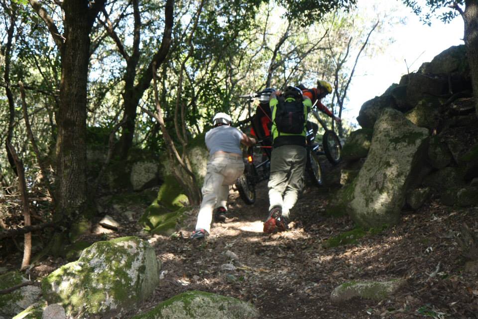 Fauteuils Cimgo, Joëlettes, Fauteuils tout terrain, tricycles adaptés ont descendu les chemins escarpés et caillouteux guidés par des accompagnateurs formés à leur conduite. Les bénéficiaires de cette randonnée particulière sous un soleil de printemps, ont pu ainsi bénéficier de sensations peu communes et d’un paysage à couper le souffle. Quatre rotations de quarante minutes à une heure ont été effectuées sur la journée, encadrées par des bénévoles qui les suivaient en VTT, sécurisant ainsi le parcours et prêts à intervenir en cas de danger ou de difficultés. Parmi eux des adhérents APF de Corse du sud, des jeunes du foyer éducatif de la FALEP et leur éducateur Benoît Lions et Mégane Quessada, stagiaire à la FALEP, des personnes bénévoles de tout âge venues apporter la chaleur de leur présence, les bienfaits d’une conversation ou une participation plus active ou sportive. C’était le cas de Pierre-Paul Cussedu et Frédéric Poli qui sur leur VTT ont été surpris du caractère sportif de la sortie. Thierry Corbalan, le Dauphin Corse, plus habitué à de fortes sensations en mer s’est dit lui aussi conquis par cette forme de randonnée. Harnaché dans son fauteuil, il a pu goûter au plaisir d’une promenade tout terrain sans se soucier de la conduite de son engin effectuée par un accompagnateur.