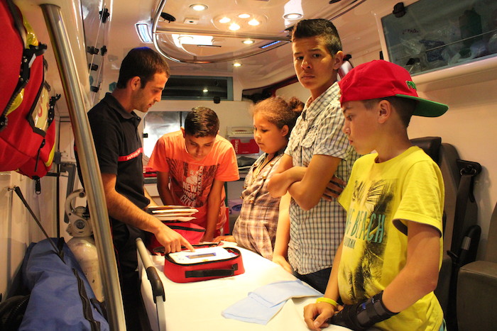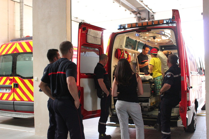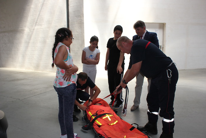 Au programme de cette après-midi, présentation des activités du service, visite des locaux, découverte des moyens et des hommes, mais aussi démonstrations de l’utilisation de l’équipement des pompiers. Défibrillateur, brancard d’hélitreuillage, visite des camions, tout y passe ! Pour la plus grande joie des ados.