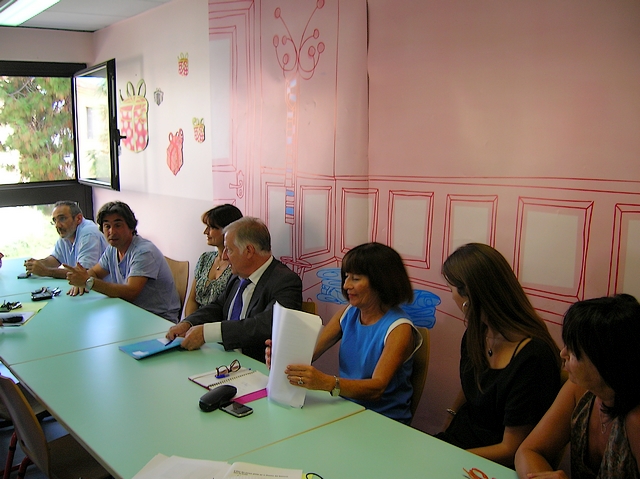 Simon Renucci, Simone Rossini, directrice de la Direction Education et Vie Scolaire, et les responsables des divers services de la ville, au groupe scolaire Sampiero vendredi. (Photo : Yannis-Christophe Garcia)