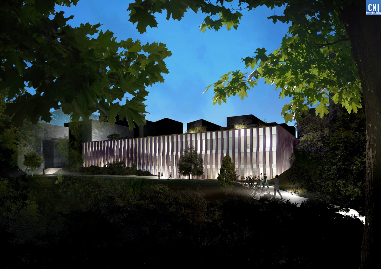 Construction du Conservatoire de musique, de danse et d’art dramatique Henri Tomasi à Ajaccio. Vecteur social intégré dans le futur écoquartier du Finosello, Il abritera également un auditorium de 200 places et l’école de musique municipale.