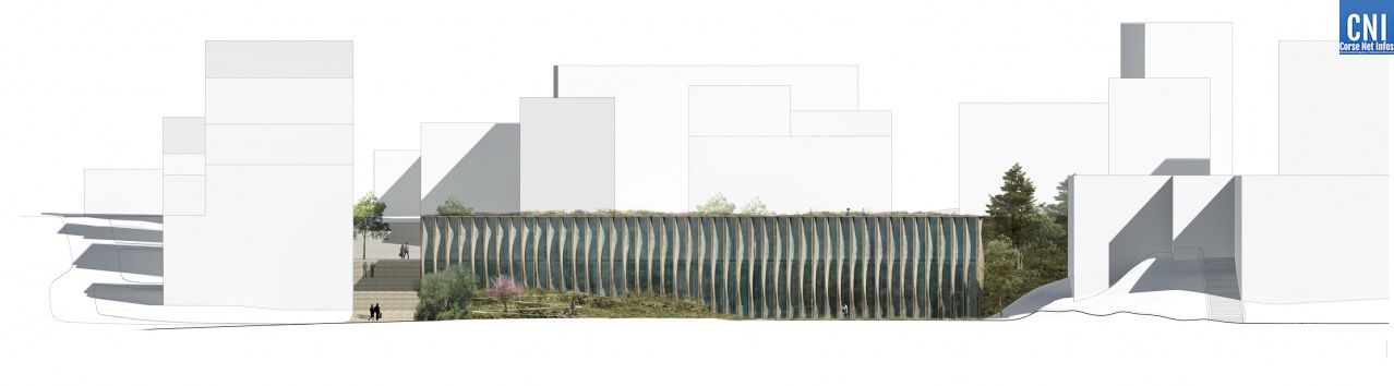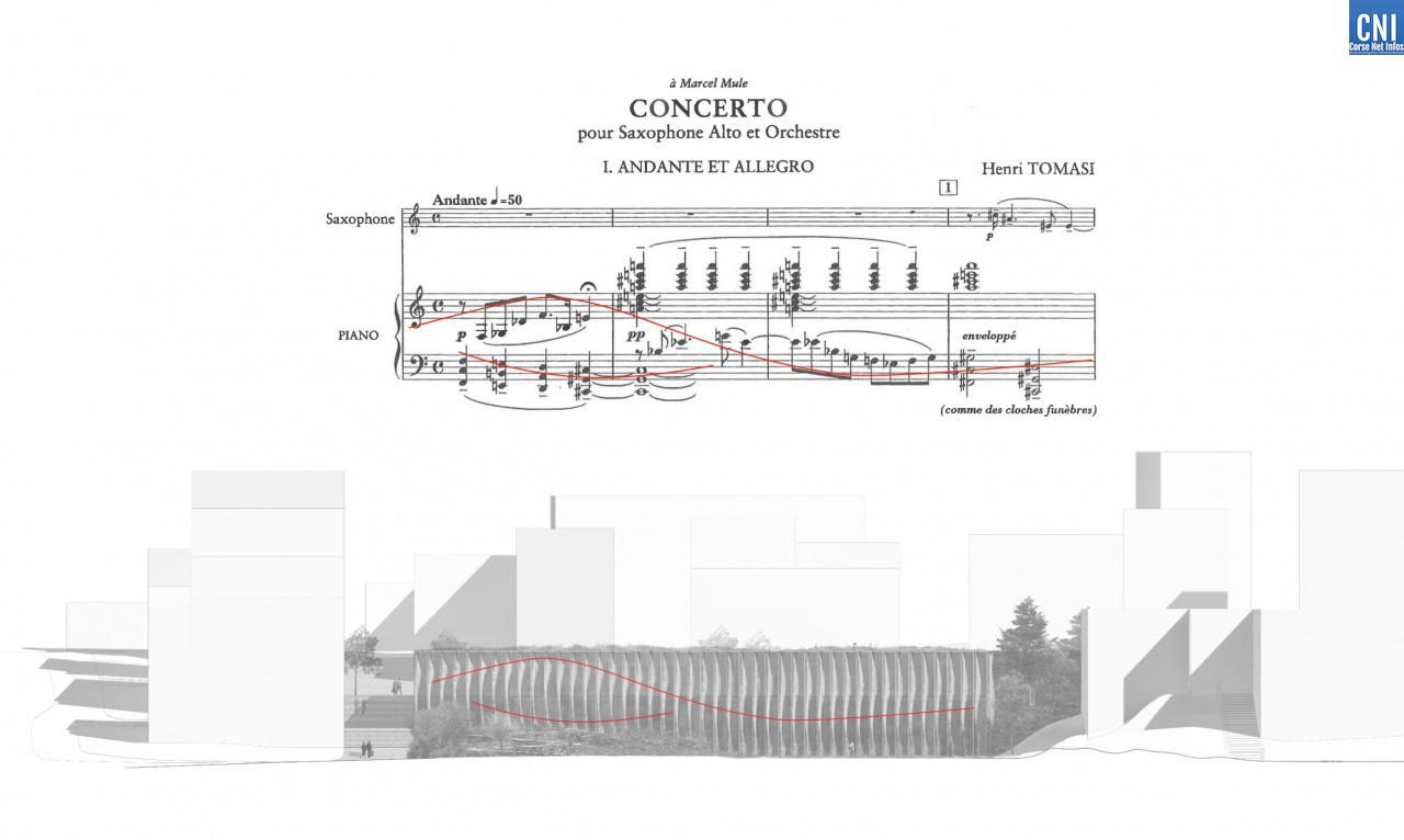 Les architectes font la proposition d’une pétrification d’une partition musicale du compositeur Henri Tomasi dans des façades brise-soleils granitiques. C’est une rencontre de l’architecture et d’une oeuvre musicale, plurielle, irréductiblement attachée à la Corse. Un travail de transposition de cette composition fait de ces façades un support à la musicalité : c’est un jeu du silence et de la note, de l’ombre et de la lumière. Le rythme, les blancs, les hauteurs sont traduits par les vides et l’ondulation double de ces hauts monolithes.