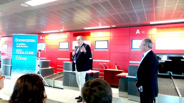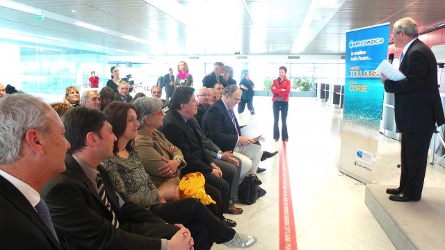 Retour à l'aérogare de Blagnac pour célébrer le trait d'union entre Toulouse et la Corse. Jean-Michel Vernhes, président du directoire d'aéroport souligne "l'extraordinaire progression de l'offre sur l'Ile de Beauté". Une progression dont il souhaite que Air Corsica soit le fer de lance. "Pour resserrer les liens industriels et économiques entre Midi-Pyrénées et Corse. Pour établir un lien constant".