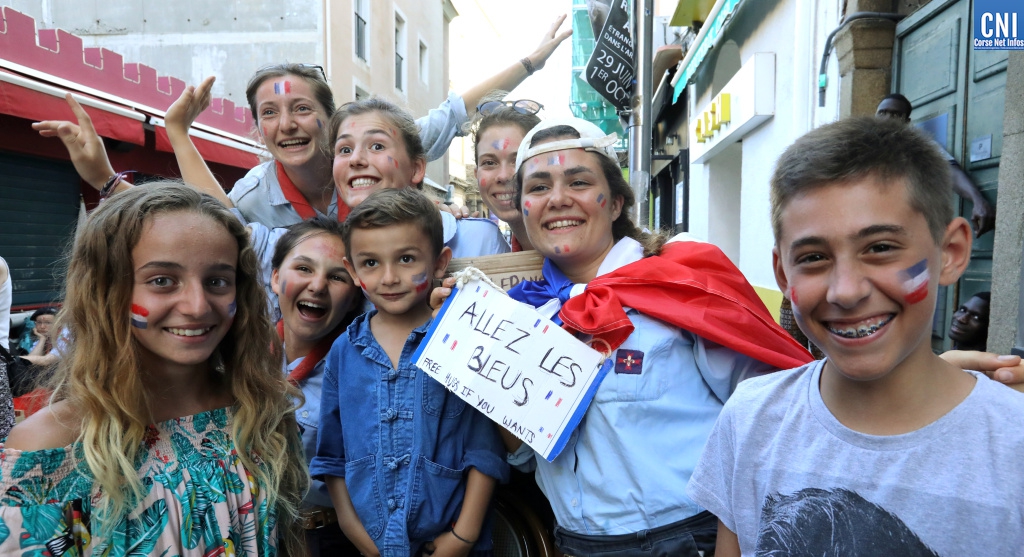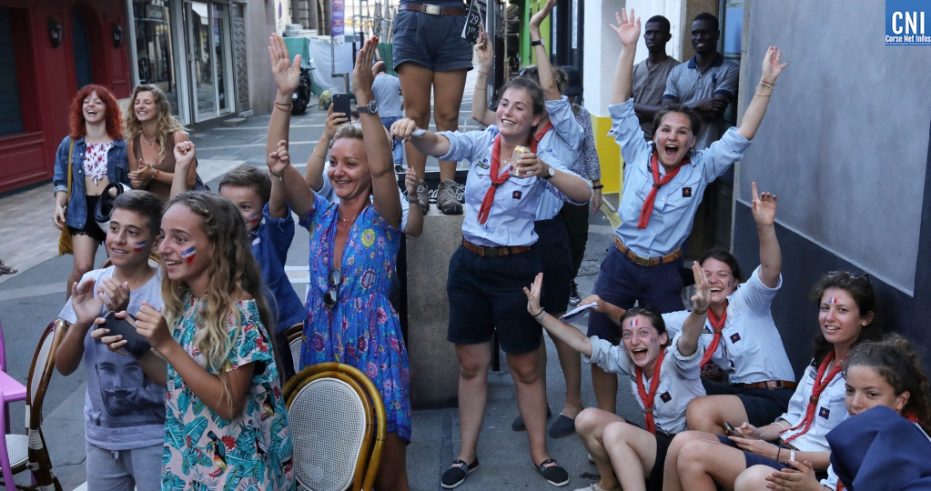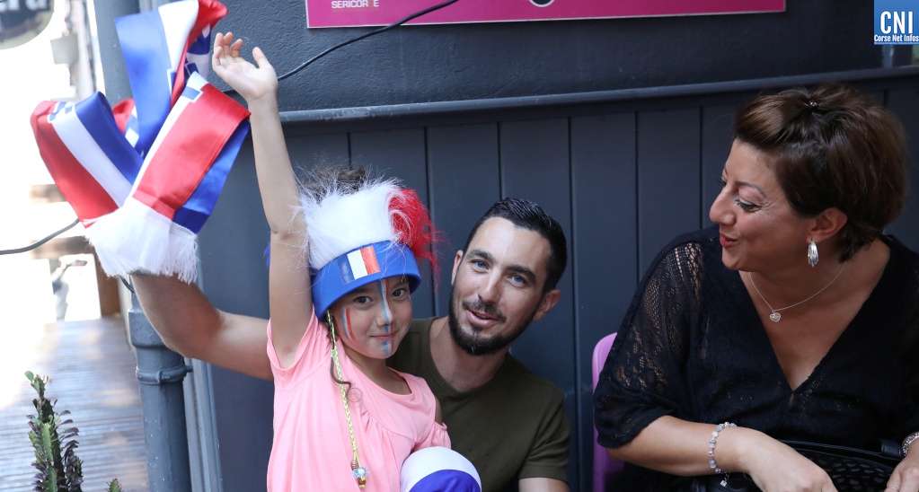 Ajaccio s’est mise cet après-midi, à l’heure de la coupe de la coupe du monde de football. Partout dans les rues, les bars, les terrasses des cafés ont été prises d’assaut par des supporters tricolores, pour la plupart des touristes. On a pu les entendre vibrer après les buts, s’inquiéter en première période et se libérer au coup de sifflet final. Par dizaines ils ont défilé dans les rues d’Ajaccio en klaxonnant, mêlés à une partie de la population locale qui a elle aussi fêté la victoire des Bleus.. Les piétions, regroupés aux abords de la place du Diamant, n’étaient pas en reste.