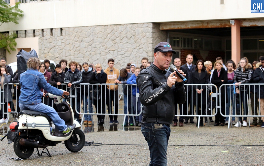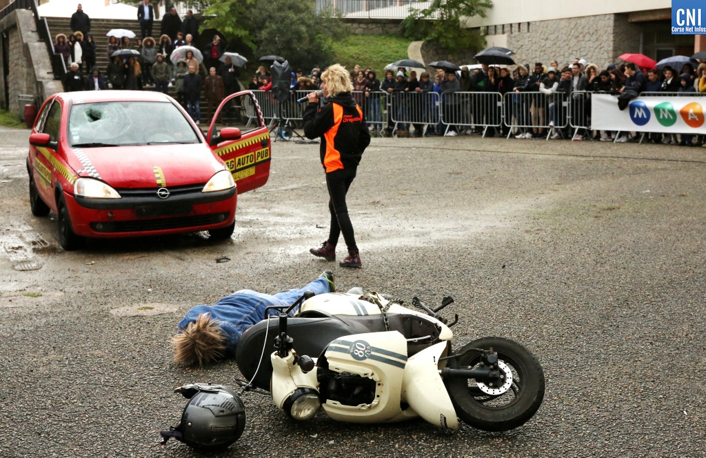 Josiane Chevalier, Préfète de Corse s’est donc rendue ce matin au lycée Laetitia Bonaparte afin de rencontrer les jeunes élèves mais aussi pour assister avec eux à un crash test grandeur nature. Voiture contre moto avec un mannequin très réaliste.
