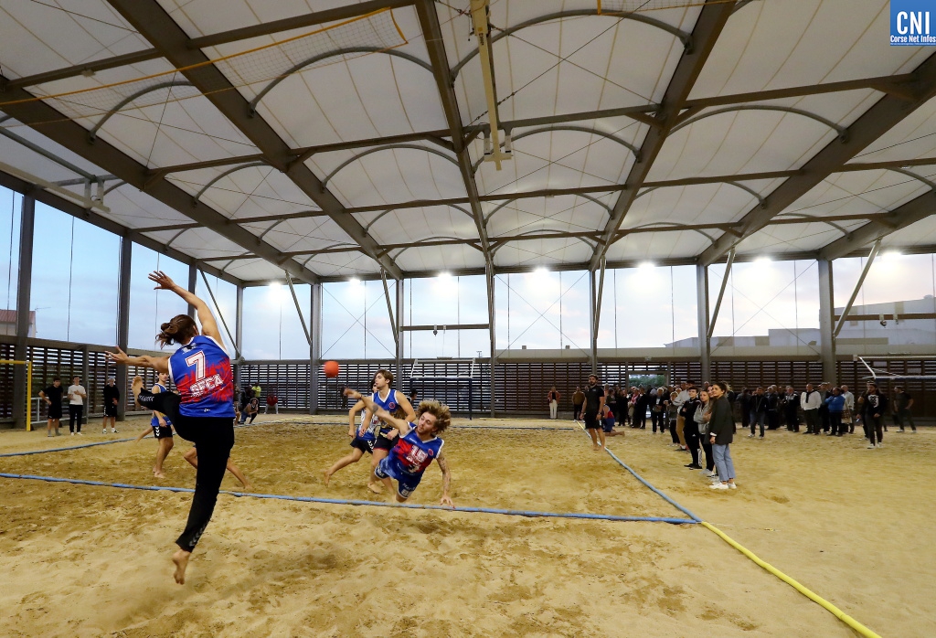 C'est une structure flambant neuf d'une grande rareté en France. Le nouveau terrain de sports de sable du CSJC, tout juste livré en début d'année, a enfin été officiellement présenté aux quelques dizaines de personnalités qui ont pu assister à une démonstration de beach handball, menée par les joueurs de l'association du Gazélec Football Club Aiacciu. L'édifice, dont la construction avait débuté en 2020, est équipé d'un toit, d'une thermorégulation et propose 1200 m² de terrains entièrement recouverts de sable. "On peut aussi bien pratiquer dans cette salle du beach handball, du beach volley, du footy volley, du beach soccer ou du beach tennis, détaille tout sourire Danielle Antonini, présidente du CSJC. C'est extrêmement rare d'avoir une structure couverte, à la fois fraîche en hiver et pas chaude l'été."