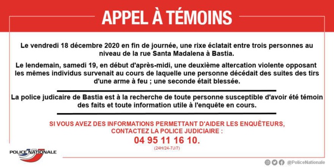 Le 19 décembre dernier en début d'après-midi des coups de feu ont éclaté rue Santa Maria Madalena à Lupino : un homme était tué, un second blessé. Quant à l'auteur des coups de feu il s'était rapidement constitué prisonnier. Depuis les faits l'antenne de la police judiciaire de Bastia est à la recherche d'éventuels témoins de la scène et de l'altercation qui a eu lieu la veille, mais aussi de toute personne susceptible de fournir "toute information utile à l'enquête en cours". Pour ce faire, le service de la police judiciaire a lancé un appel à témoins.