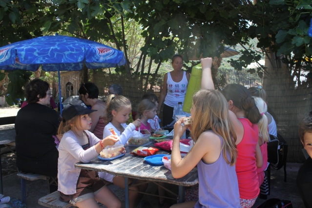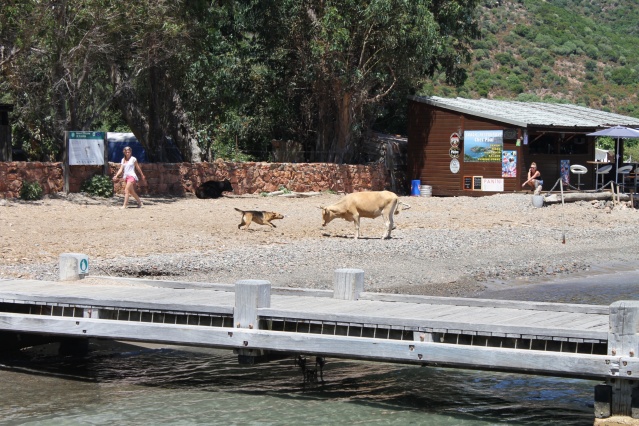 12H15 arrivée à Girolata. Oubliés les nausées et quelques vomissements. Le site est magnifique. Beaucoup n’y sont jamais venus et découvrent la beauté de l’île sur laquelle ils vivent. Mais, du haut de leur 6-10 ans, les enfants reviennent vite les pieds sur terre : ils ont faim. Il était prévu de pique-niquer sur la plage. Malheureusement, la place est déjà prise…par des vaches ! Il faut trouver un autre endroit. Le propriétaire du restaurant « la cabane du chasseur » accueille gentiment tout ce petit monde à l’arrière de son restaurant aménagé en aire de pique nique. Le paradis pour les enfants qui, après avoir avalé rapidement leur repas froid, s’approprient les lieux comme terrain de jeux. Puis, c’est vite, trop vite, qu’arrive l’heure du départ pour un retour vers les familles des enfants qui n’auront pas de mal à faire dormir leur bambin ce soir là.