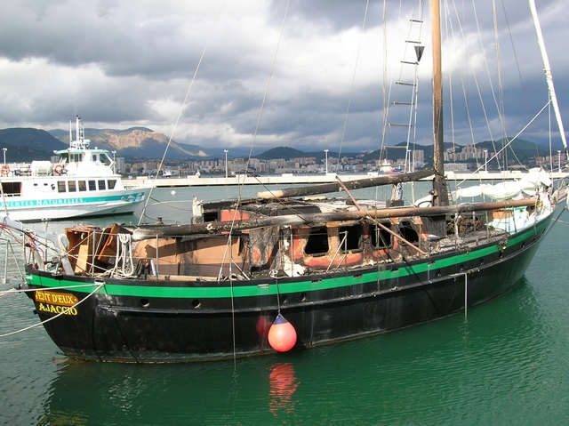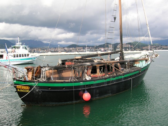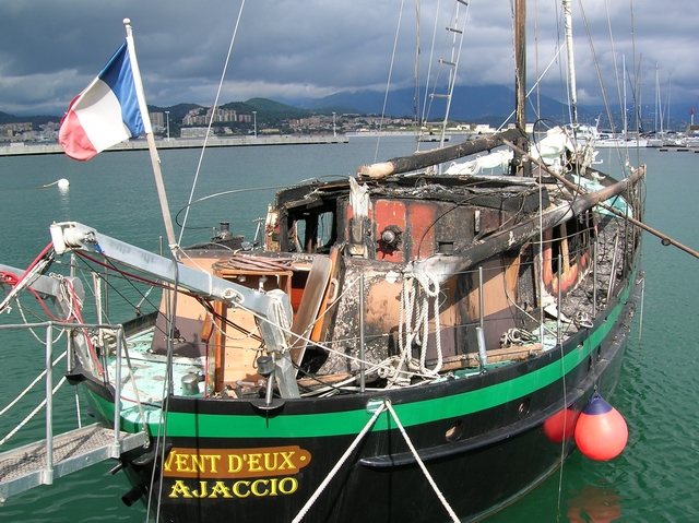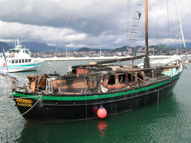 Le vieux gréement, construit en 1945 et utilisé pour effectuer des promenades en mer et des croisières a été ravagé par les flammes dans le port d'Ajaccio à cause d'une défaillance du circuit électrique. Malgré l'intervention rapide des secours, le navire a été réduit à l'état d'épave. (Photo Yannis-Christophe Garcia)