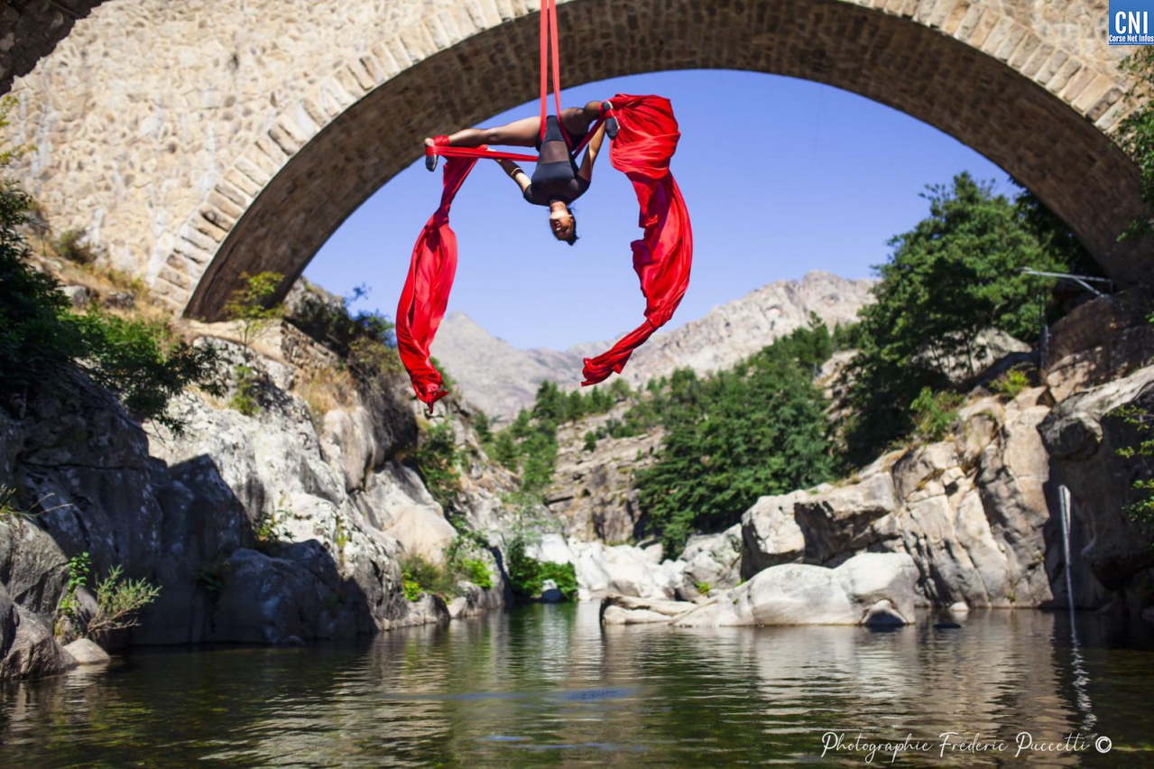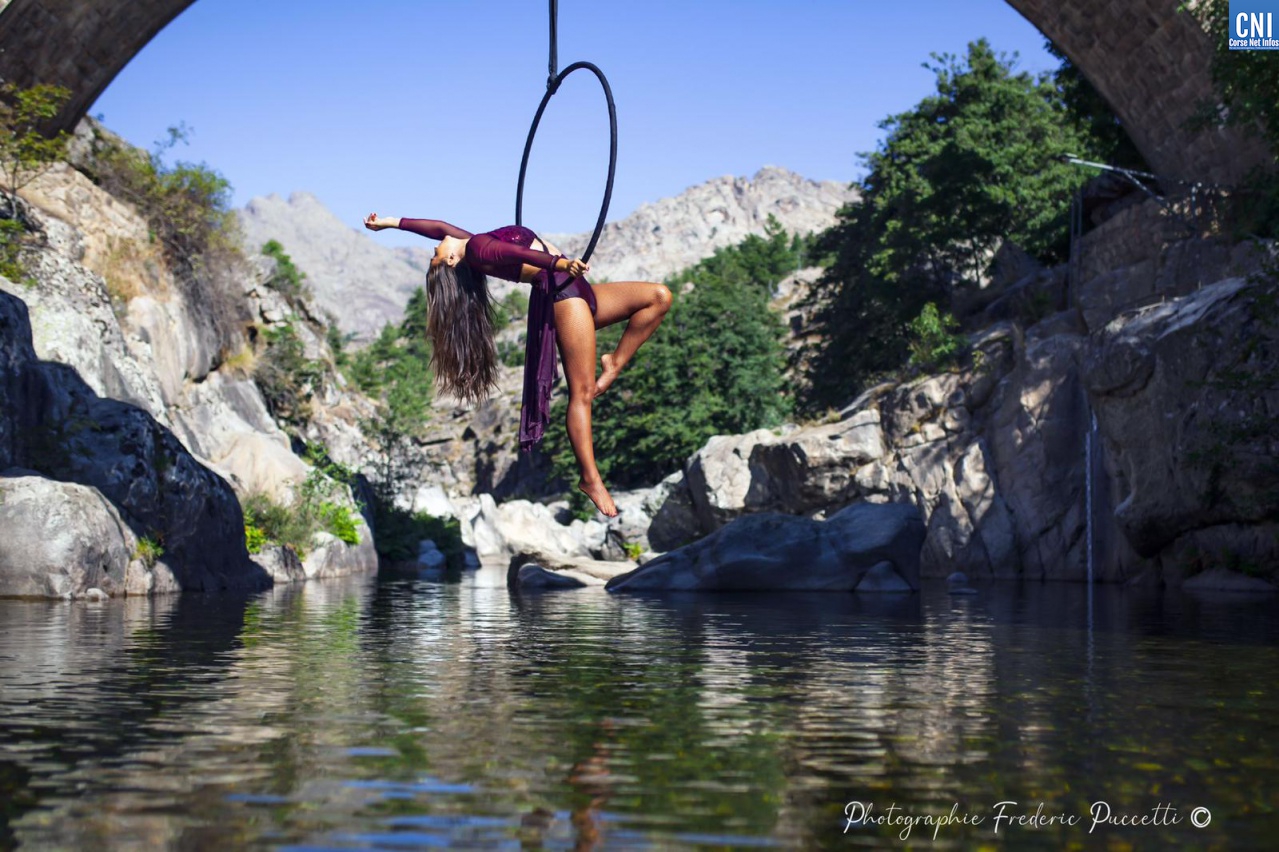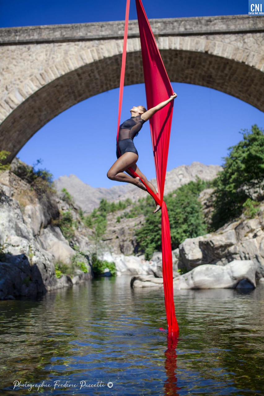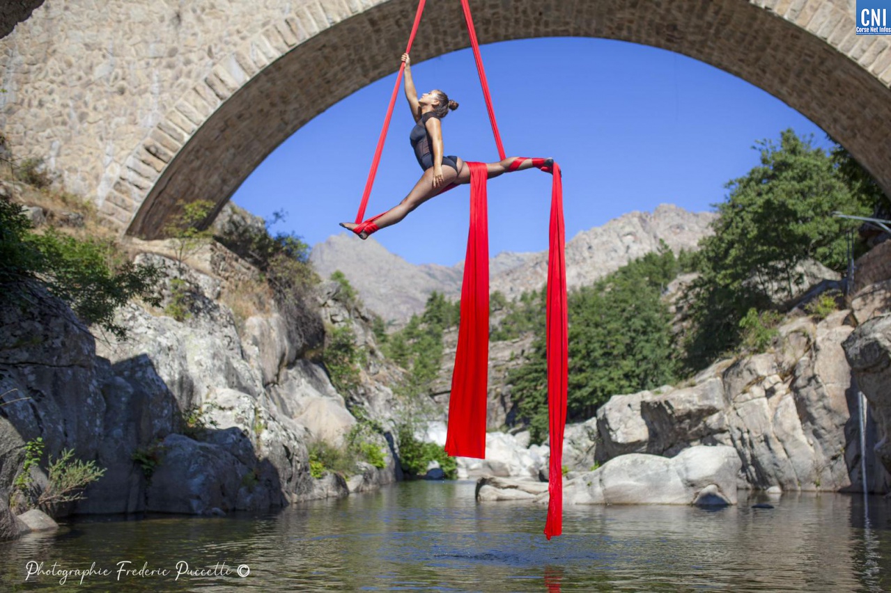 Des arabesques aériennes sous le Ponte Altu d'Albertacce : l'idée est de Frédéric Puccetti, photographe professionnel de talent, qui n'hésite jamais à se jeter à l'eau quand il estime que, comme ce fut le cas récemment à Albertacce pour ce shooting particulier - le jeu en vaut la chandelle. En tout cas, tout comme Alba Colombani, de la "Compagnie des Mines de Rien", qui suspendue au pont génois a multiplié les figures au trapèze, au cerceau et au tissu, il a donné le meilleur de lui même pour tirer parti de la beauté du lieu et de celle d'Alba...