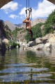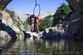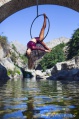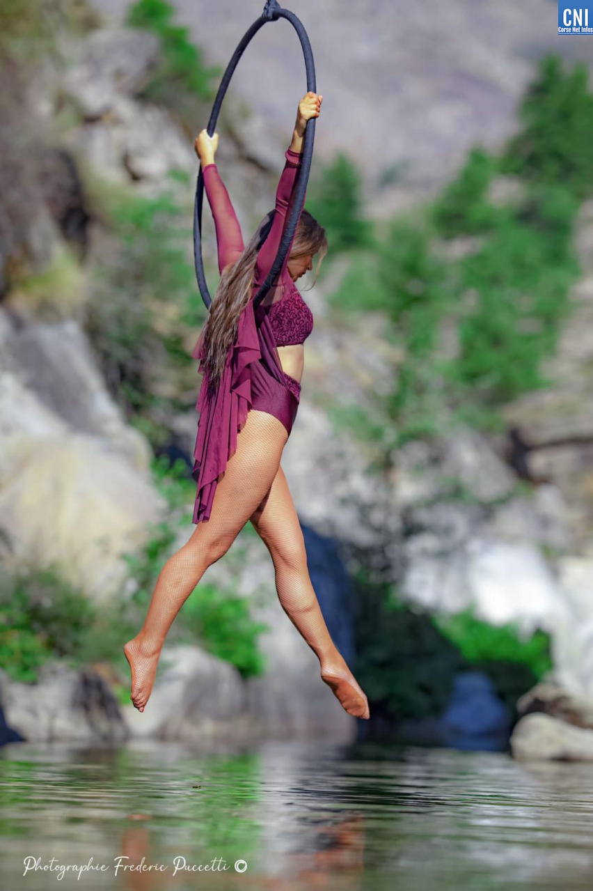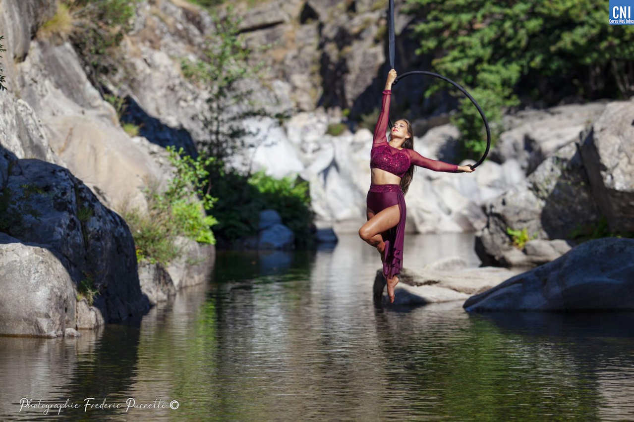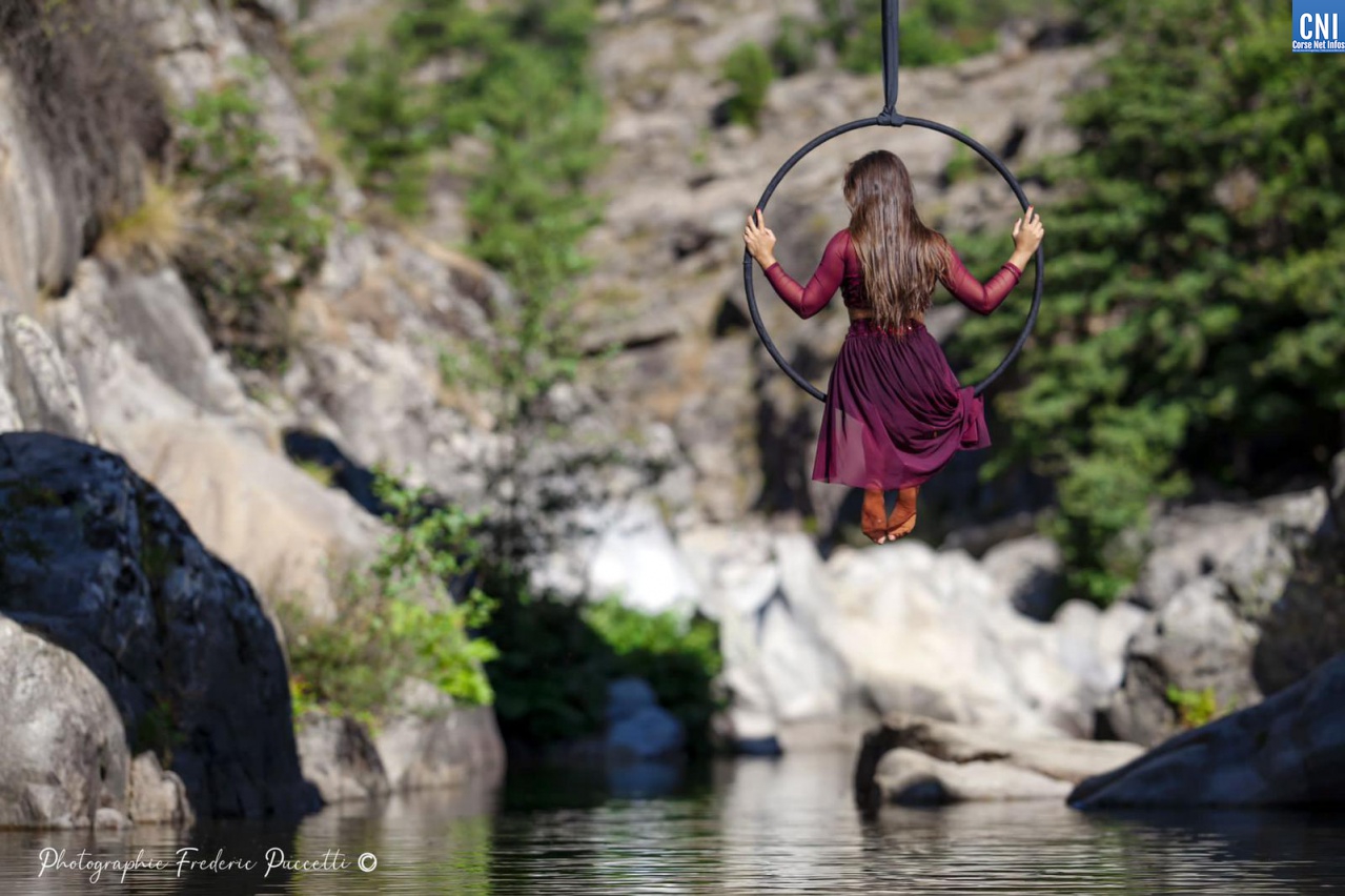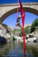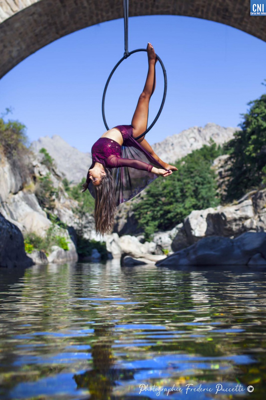 Des arabesques aériennes sous le Ponte Altu d'Albertacce : l'idée est de Frédéric Puccetti, photographe professionnel de talent, qui n'hésite jamais à se jeter à l'eau quand il estime que, comme ce fut le cas récemment à Albertacce pour ce shooting particulier - le jeu en vaut la chandelle. En tout cas, tout comme Alba Colombani, de la "Compagnie des Mines de Rien", qui suspendue au pont génois a multiplié les figures au trapèze, au cerceau et au tissu, il a donné le meilleur de lui même pour tirer parti de la beauté du lieu et de celle d'Alba...