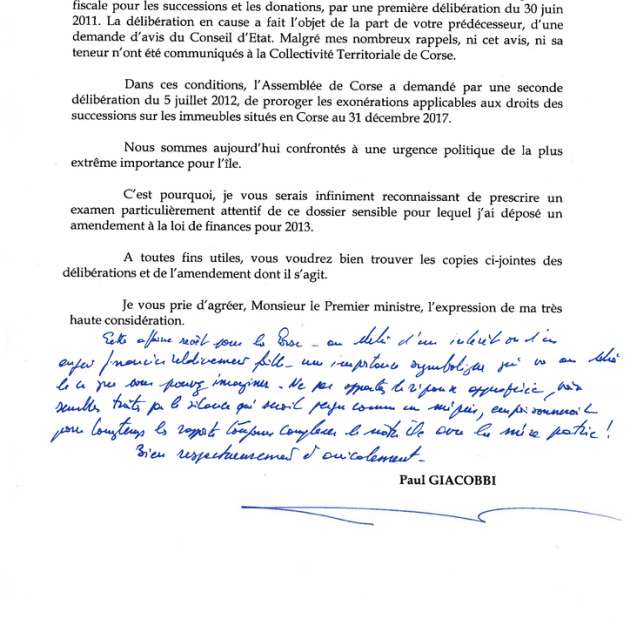 1. la prise en considération des conséquences dommageables qu’aura le retour progressif au droit commun fiscal applicable aux successions comportant des biens et droits immobiliers, planifié par la loi du 22 janvier 2002 entre le 1er janvier 2013 et le 31 décembre 2017 : en n’instituant qu’un seul palier entre l’exonération totale et la taxation à taux plein, ainsi qu’en faisant passer en une seule fois de vingt-quatre à six mois le délai de déclaration des successions, il met en cause le principe d’égalité qui aurait dû conduire à mettre en place une progressivité extrêmement lissée ; durant la période transitoire et a fortiori à compter du 1er janvier 2018, s’il épargnera en partie les héritages modestes et moyens en ligne directe, il pénalisera lourdement tous les héritages en ligne collatérale, proportionnellement plus nombreux en Corse que sur le continent, ce qui entraînera inévitablement l’aliénation de la très grande majorité des biens reçus ; l’importance des droits à payer, assortie à la disparition des incitations fiscales et aggravée par l’absence d’alignement du régime des donations entre vifs sur celui des successions, aura également un effet dissuasif à l’égard d’héritiers recevant des biens dépourvus de titres de propriété et indivis, et les incitera soit à conserver ces biens dans l’indivision, soit à les aliéner ; ainsi, il ne pourra que constituer un facteur d’aggravation de la crise foncière ;