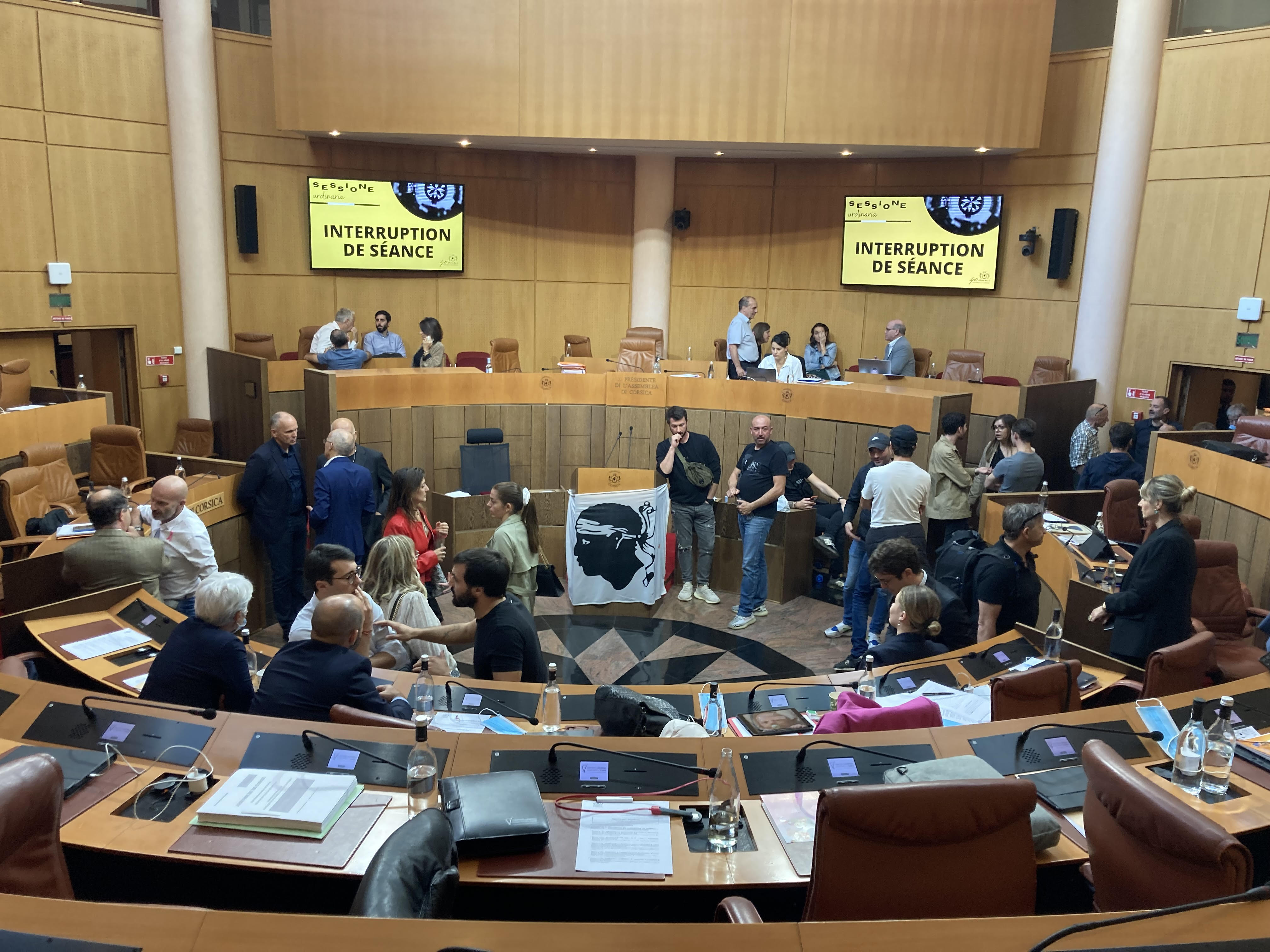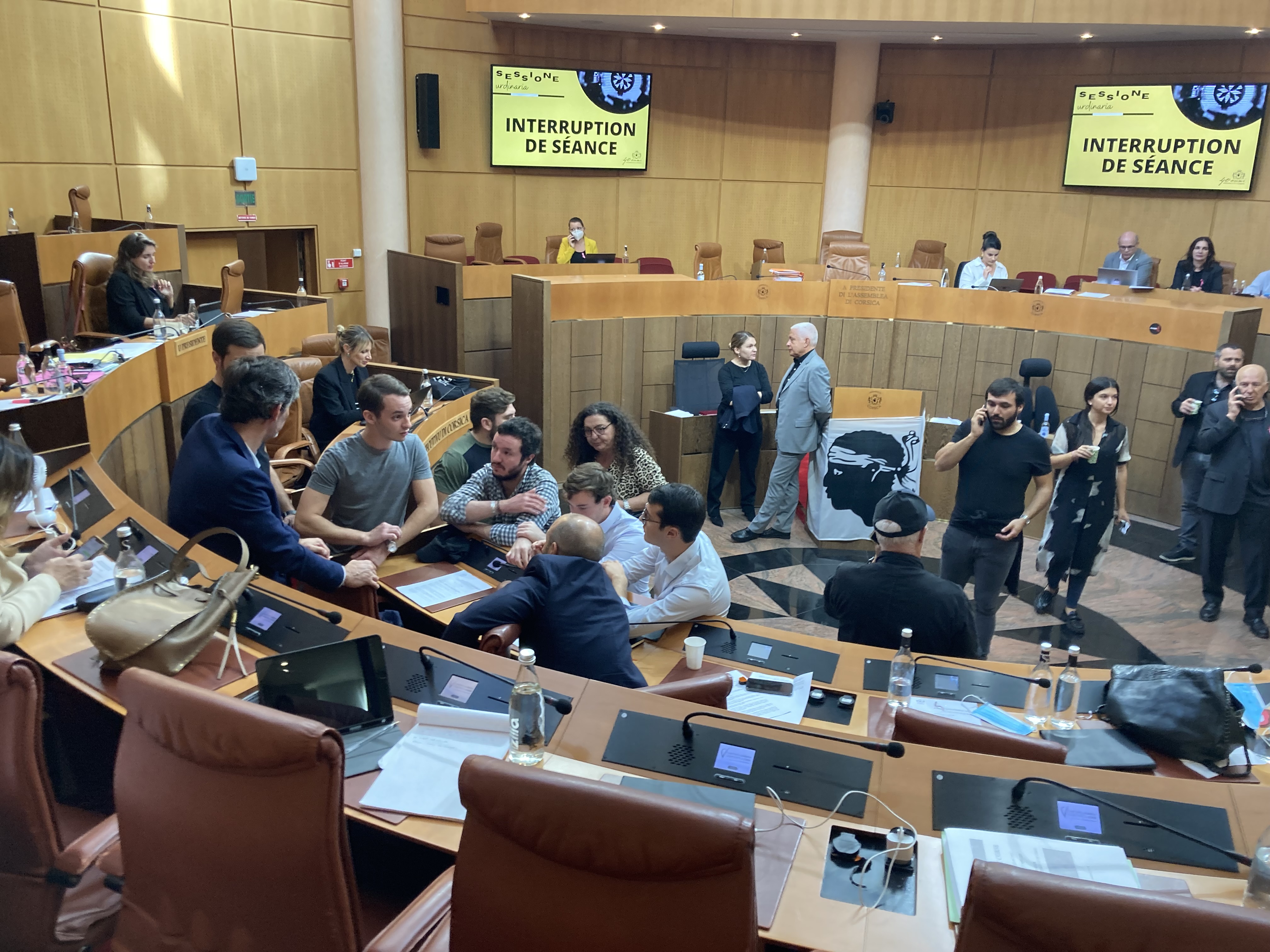 L’Assemblée de Corse venait à peine d’entamer sa deuxième question orale lorsque l’auteur de celle-ci, Don Joseph Luccioni, élu de Femu a Corsica, fut brutalement interrompu par des cris émanant de la porte principale de l’hémicycle dont un groupe de personnes tentait de forcer l’entrée. Ladite porte avait été fermée quelques secondes auparavant par le service de sécurité après qu’une cinquantaine de personnes ait forcé les grilles de l’Hôtel de région. Face à cette situation, le président de l’Exécutif, Gilles Simeoni, a immédiatement demandé une suspension de séance et s’est porté à leur rencontre, suivi par d’autres élus nationalistes. Les manifestants, représentant les onze associations de prisonniers, rassemblées autour du Collectif L'Ora di u ritornu, mais aussi des syndicats étudiants de tous bords, demandent qu’une résolution solennelle soit votée par l’Assemblée de Corse. Après une discussion dans les travées, la présidente de l’Assemblée, Nanette Maupertuis, a accepté que Camille Martelli, la porte-parole des collectifs, lise, à la tribune, une déclaration comme elle l'avait déjà fait, le 24 octobre devant le centre de détention de Borgo, reprenant toutes les revendications des collectifs et des associations qui sont venues se greffer à sa démarche. La tension est, alors, retombée, mais la session est restée suspendue. Des discussions se sont déroulées en coulisses sur cette interruption intempestive et sur le contenu d'une résolution qui pourrait être proposée au vote de l’Assemblée de Corse. Une première réunion s’est tenue, à huis clos, entre les différents groupes nationalistes pour mettre au point une position commune, position qui a, ensuite, été présentée et discutée avec Jean-Martin Mondoloni, président du groupe de droite, U Soffiu Novu.