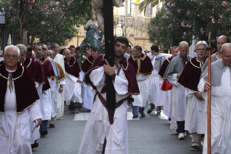 Décorée de fleurs blanches, la Sainte Vierge était portée en procession par les confrères qui se relaient tout le long du parcours, précédés par d'autres confrères de Saint Antoine et Saint Erasme.