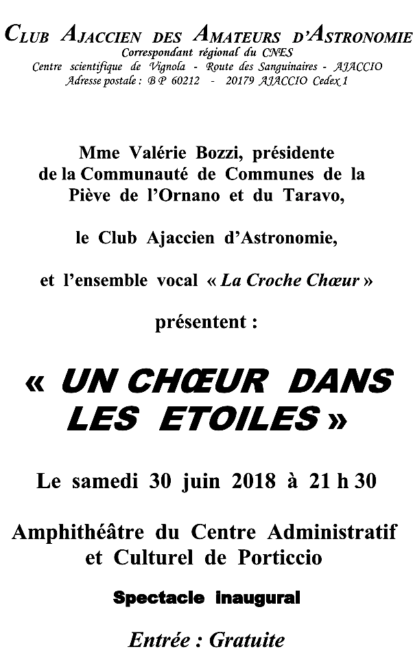 Né de la rencontre de deux passionnés, Jean-Pierre Roux, passionné de chant choral et de mise en scène, et Lucien Luciani, passionné d’astronomie, ce spectacle est l’association d’un voyage commenté à travers les merveilles de l’Univers, et de chants, profanes ou sacrés, interprétés par l’ensemble vocal «La Croche Chœur» dirigé par Jean-Louis Blaineau, membre du Chœur de Sartène et du Chœur de Corse, accompagné de deux solistes, la pianiste Isabelle Chassin et le trompettiste Joseph Carboni, le tout sur les plus beaux films et les plus belles photos du télescope spatial Hubble.