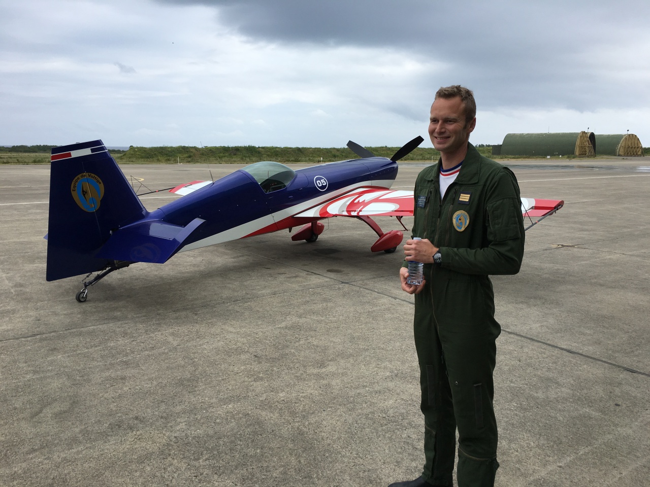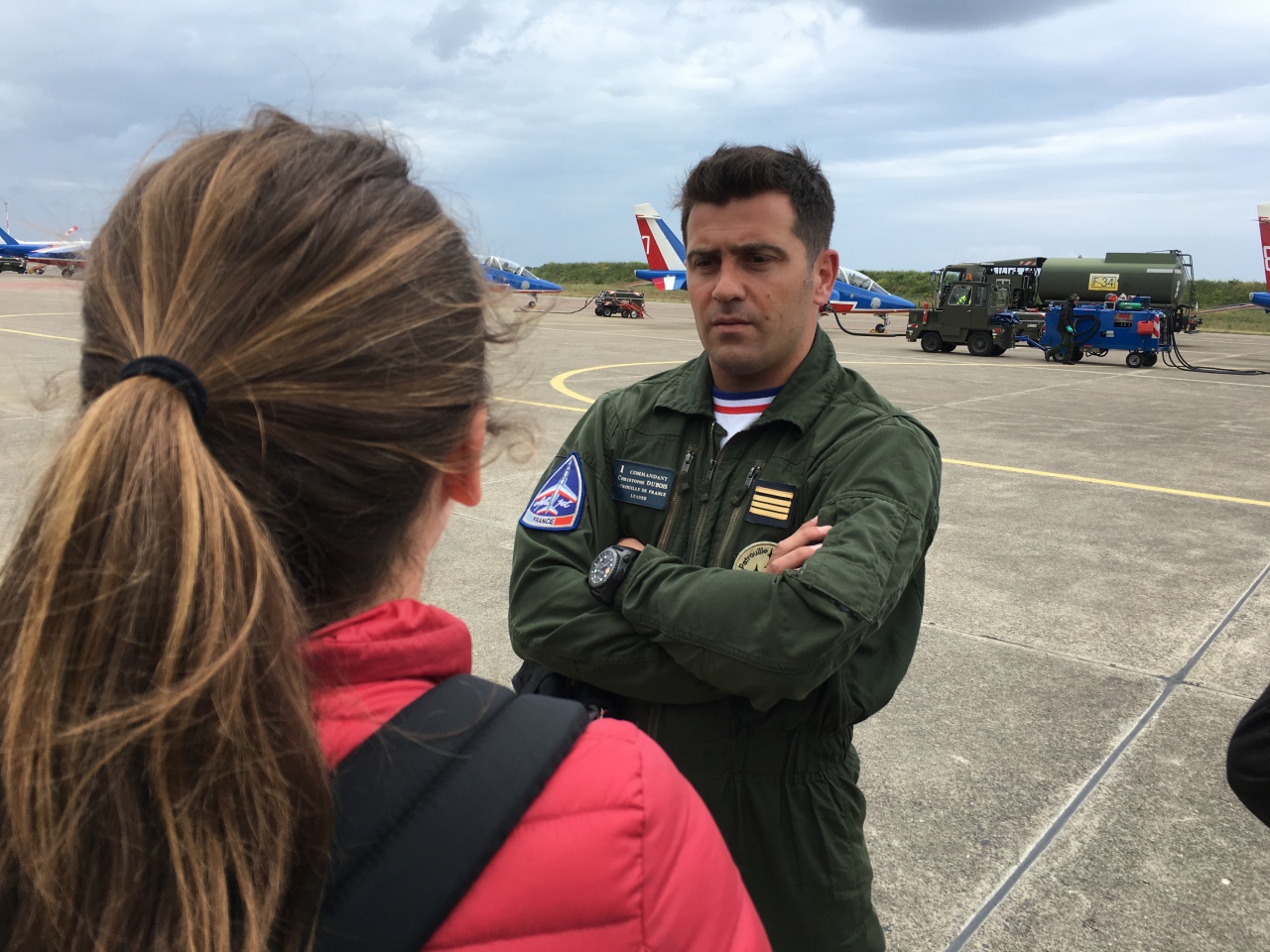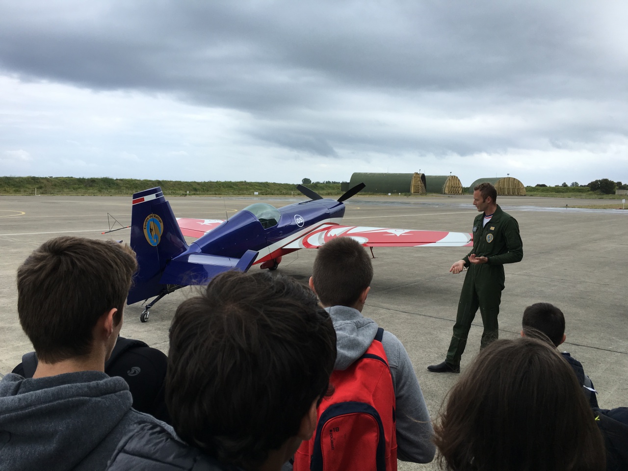 Interrogé par un jeune élève sur ses préférences en voltige, le capitaine précise : " En meeting aérien, ma préférence va vers le vol basse vitesse et les manœuvres de stationnaire. En compétition de voltige, l'une de mes figures préférées est le tonneau déclenché avec facteur de charge négatif". Avec humilité et simplicité, les officiers de la patrouille de France et de l'équipe de voltige se sont prêtés volontiers aux diverses demandes de ce jeune public.